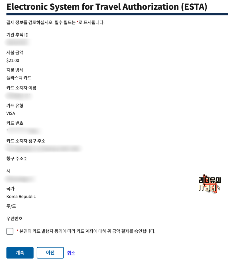 그리고 ESTA 발급 수수료를 낸다는 것을 알려주고 있습니다. 읽어 보시고 동의 하시면 됩니다.