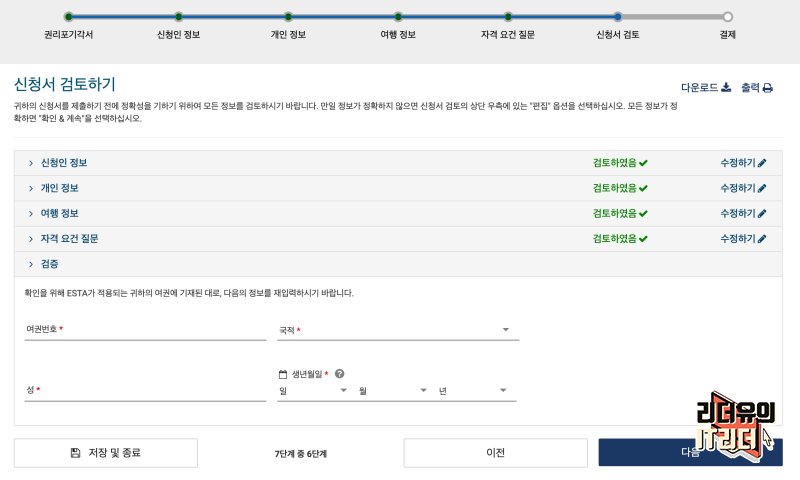 단계별로 확인 절차를 다 검토하면 마지막으로 여권번호, 국적, 성, 생년월일을 입력하게 나옵니다.