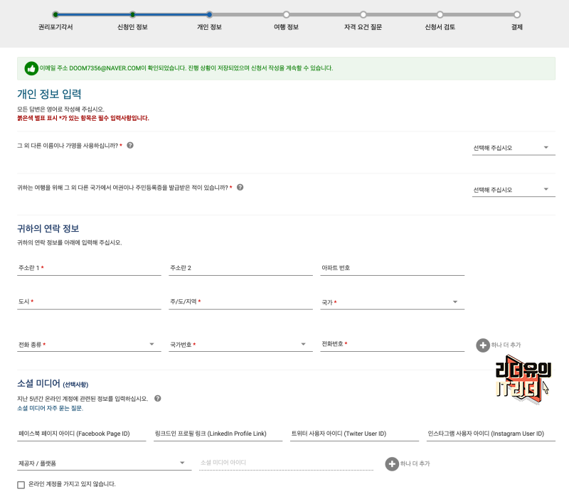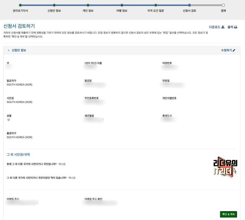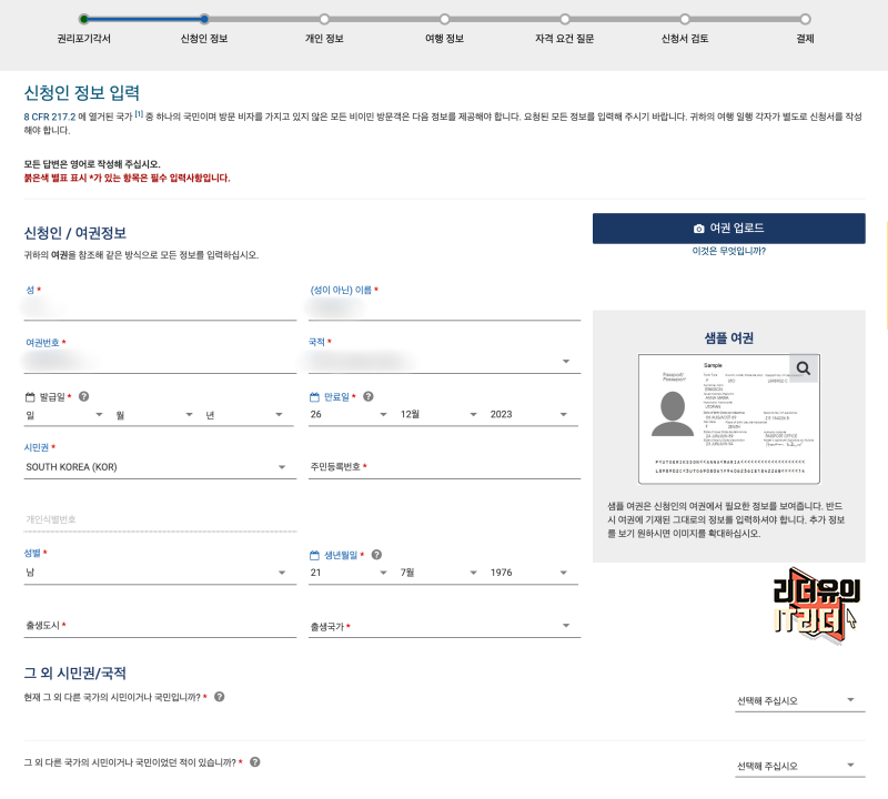 이제 신청인 정보 입력을 합니다. 뭔가 내용이 많은 것 같지만 자동으로 입력되는 내용이 많고 추가적으로 주민등록번호, 출생도시, 출생국가 등을 입력하면 됩니다. 여기서 중요한 포인트는 다 영어로 작성해야 합니다. 보이는 것만 한글이지 이 것을 검토하는 곳은 미국이니 다 영어로 해줘야 합니다.