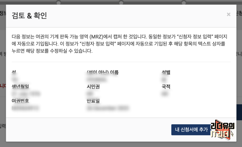 그럼 여권을 자동으로 파악해 성, 이름, 성별, 생년월일, 시민권, 국적, 여권번호, 만료일을 인식해서 보여줍니다. 내 신청서에 추가 하면 자동으로 해당 내용이 입력됩니다.