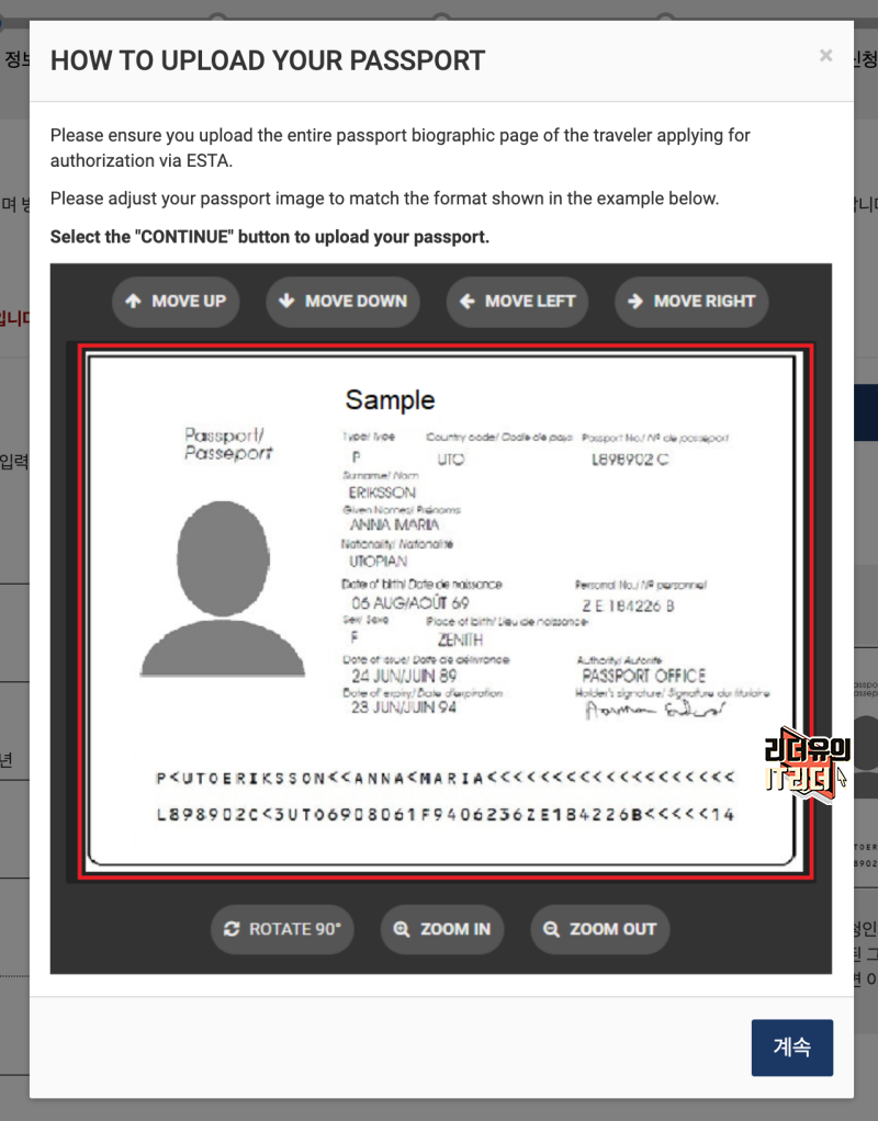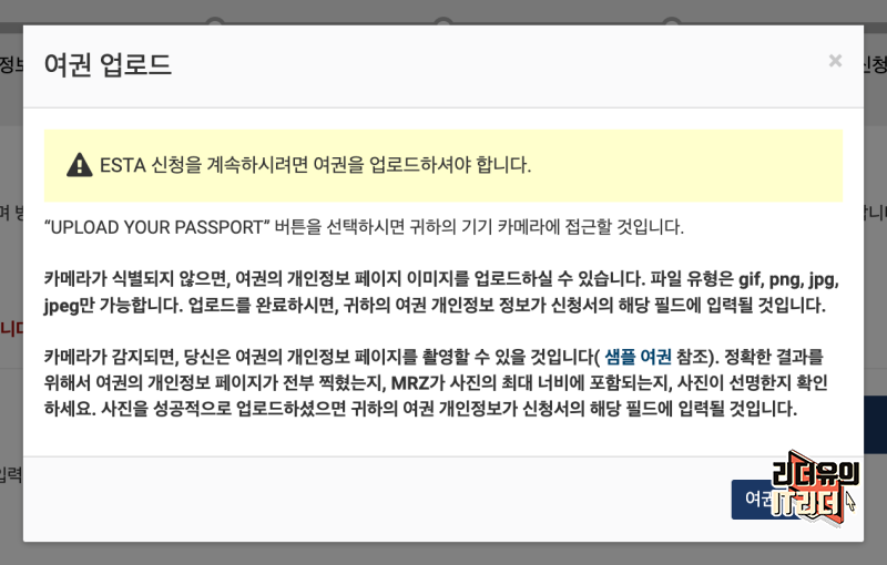 이제 여권을 업로드할 수 있게 안내가 나옵니다. 여권의 개인정보 페이지 부분을 찍어서 올리면 됩니다.