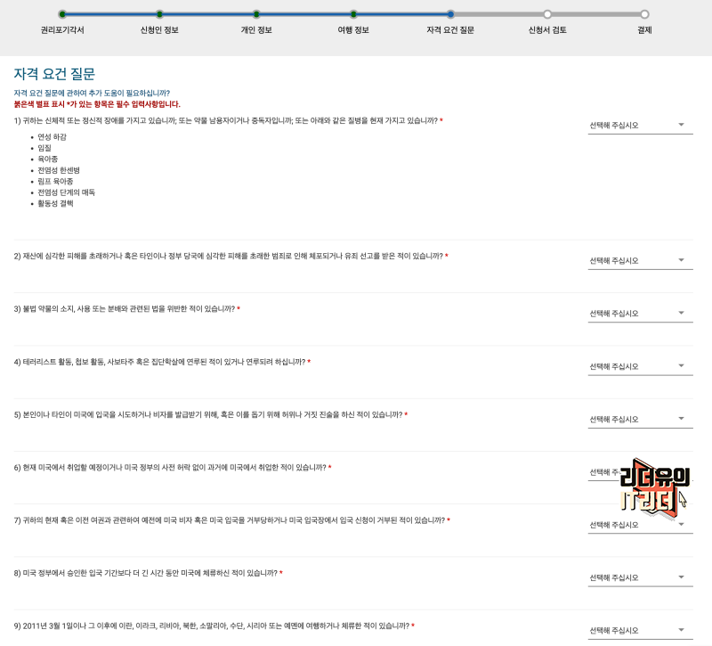 그리고 자격 요건 질문을 보고 체크를 합니다. 문제가 되는 사항이 있는지 체크하는 과정입니다.