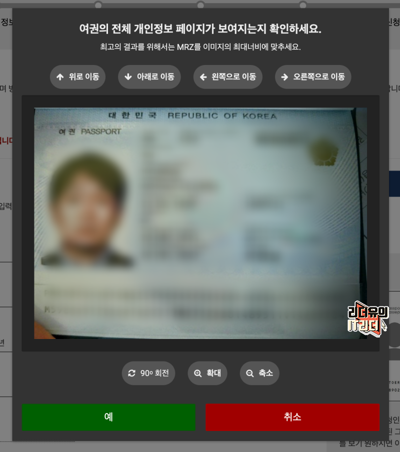 여권을 올리면 이렇게 화면이 나오고 여기서 사진 위치를 조정할 수 있게 나옵니다.