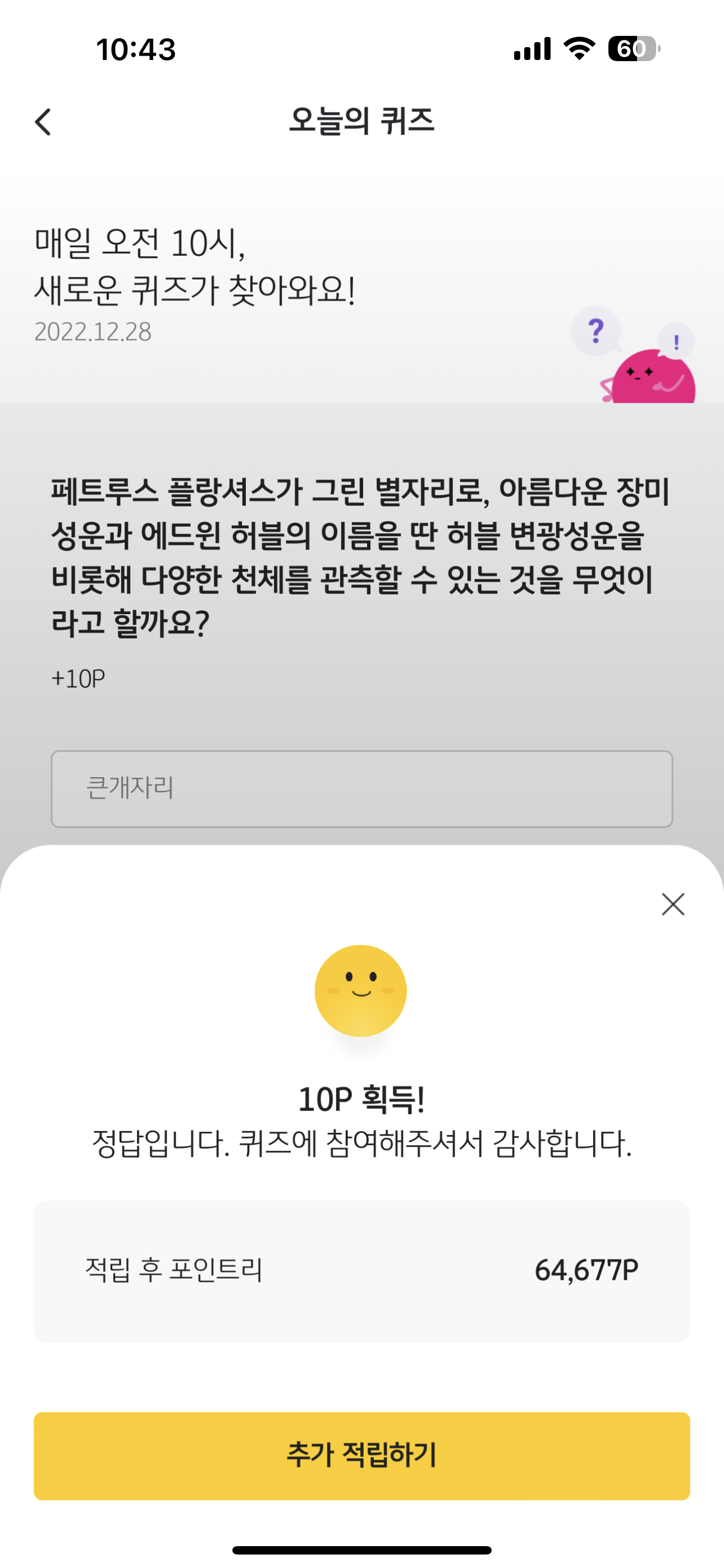리브메이트 KB PAY 오늘의 퀴즈 정답은 외뿔소자리 입니다