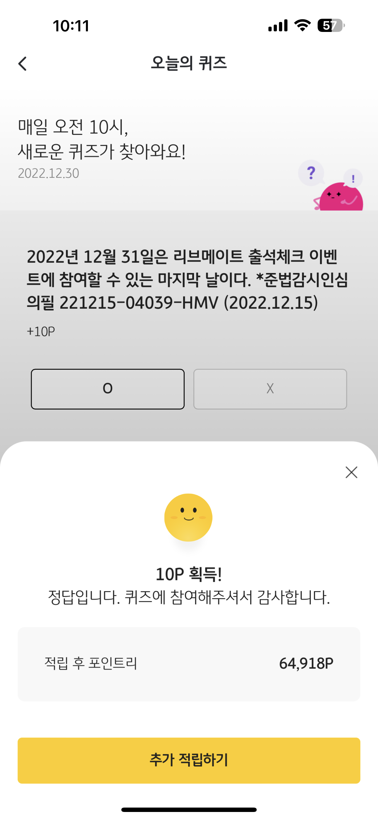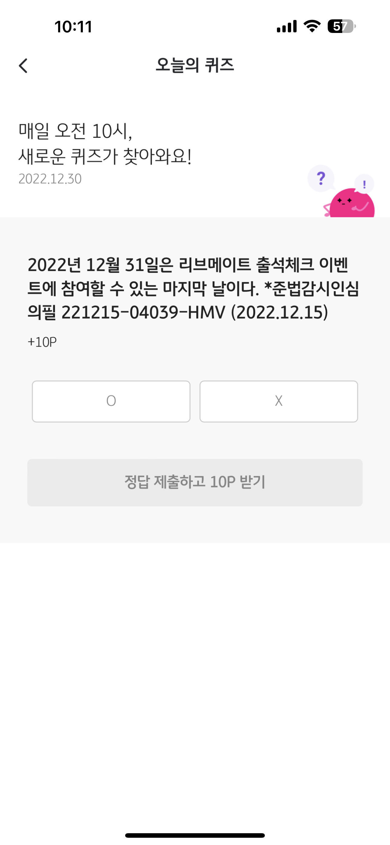 2022년 12월 31일은 리브메이트 출석체크 이벤트에 참여할 수 있는 마지막 날이다. *준법감시인심의필 221215-04039-HMV (2022.12.15) O,X 퀴즈로 나왔습니다. 이제 리브메이트와 KB PAY가 통합되면서 조금씩 리브메이트 서비스를 줄이고 있는데요. 정답은