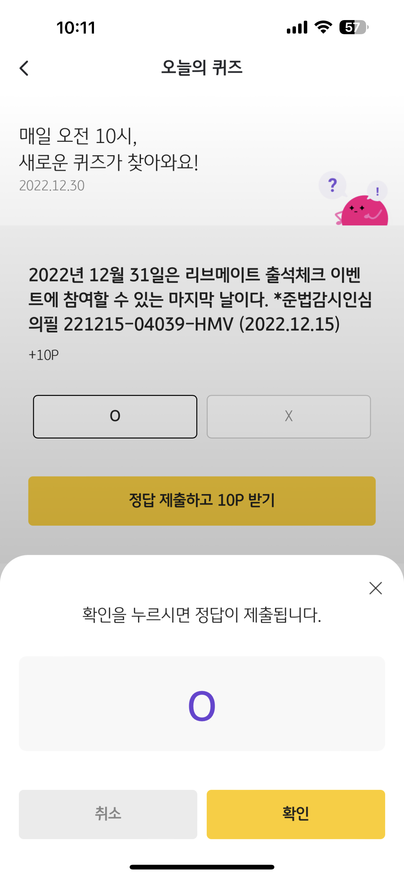 리브메이트 KB PAY 오늘의 퀴즈 정답은 O 입니다