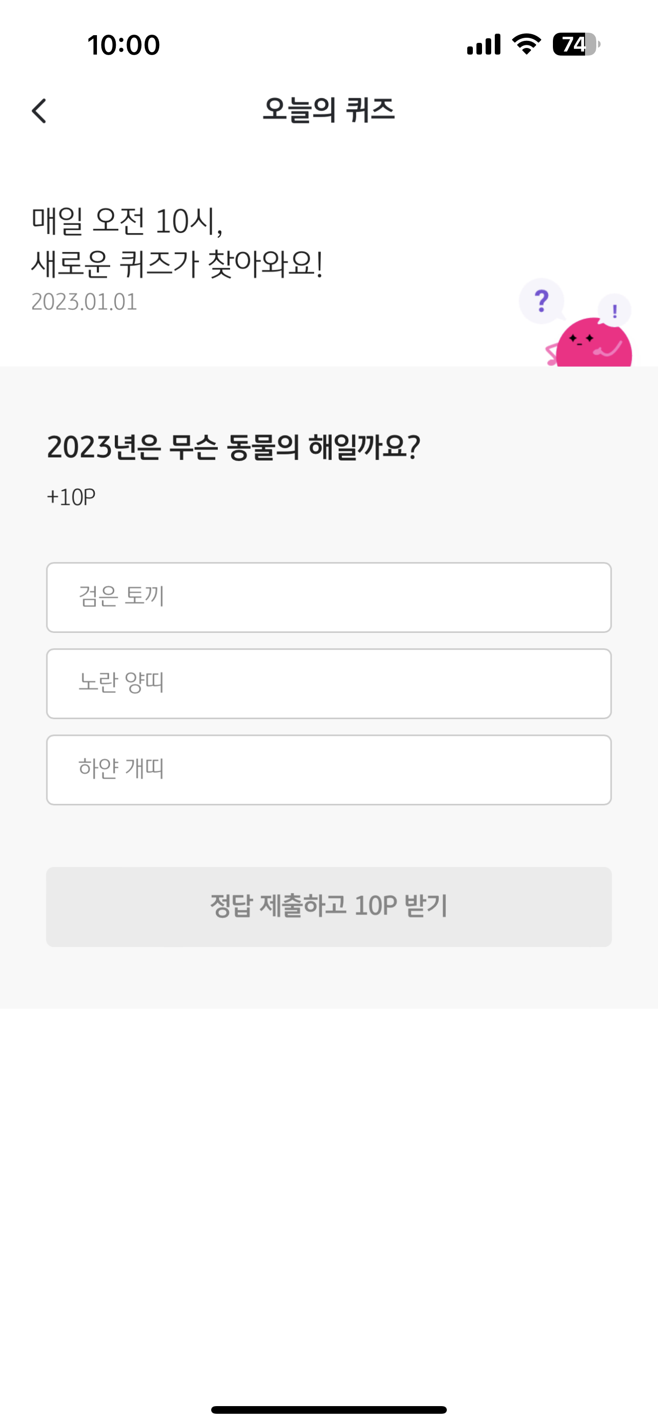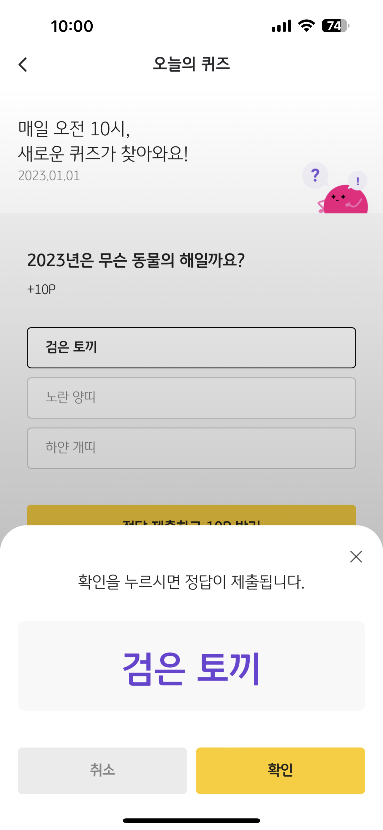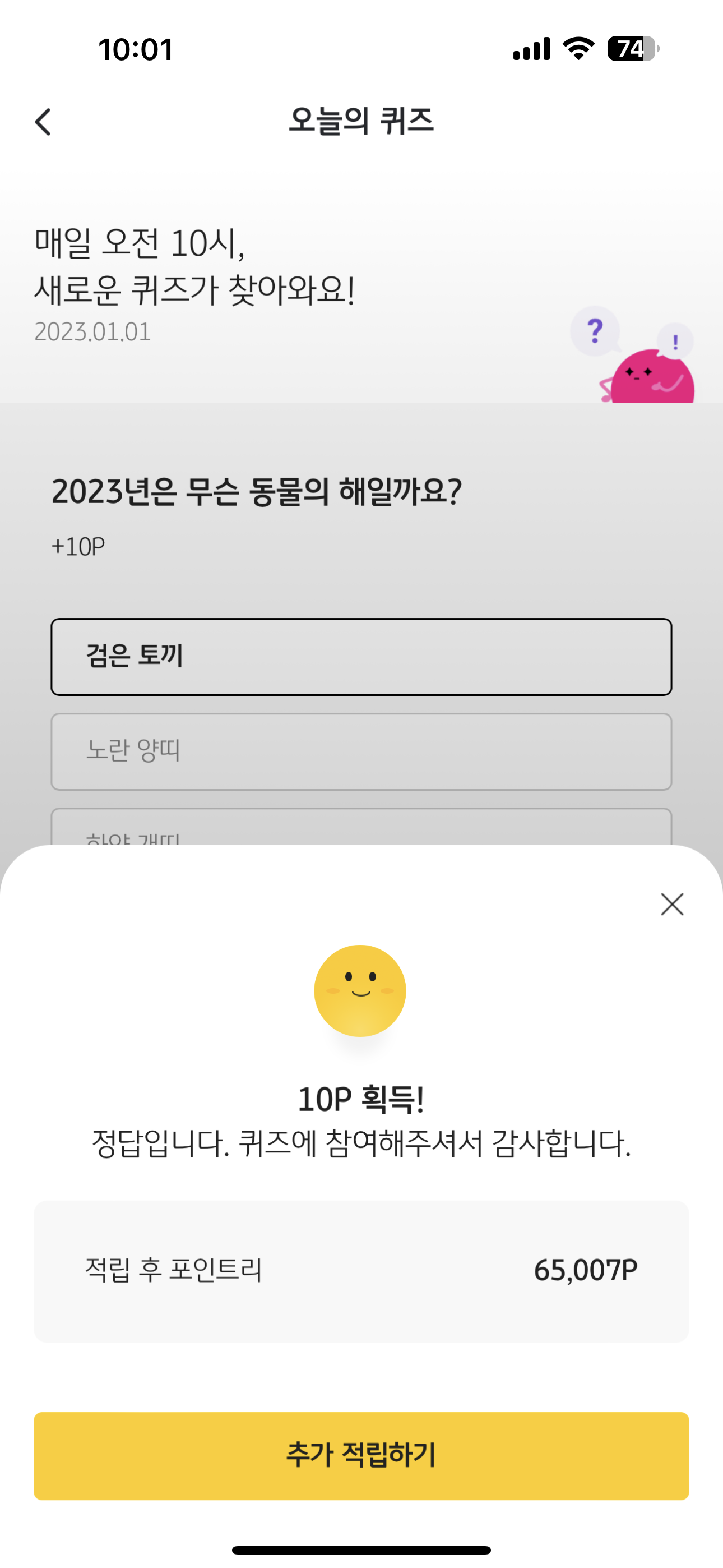 리브메이트 KB PAY 오늘의 퀴즈 1월 1일 정답은 검은 토끼 입니다