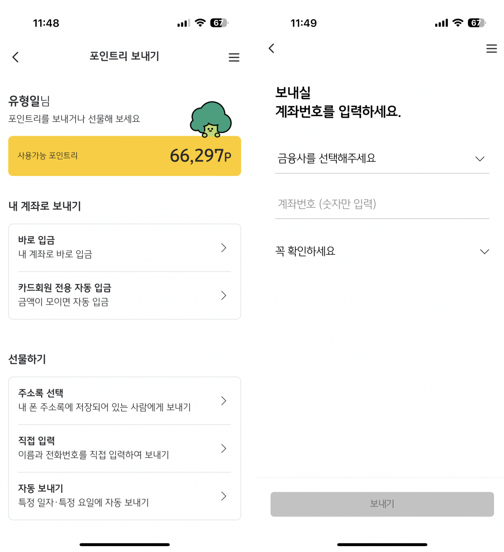 사용 가능 포인트리를 볼 수 있고 내 계좌로 보낼 지, 선물하기를 할 지 다양한 방법으로 포인트리 현금 전환을 할 수 있습니다. 내 계좌로 보내기에서 바로 입금을 선택하면 보낼 계좌번호를 입력하게 나옵니다. 계좌번호는 꼭 KB은행이 아니어도 됩니다.