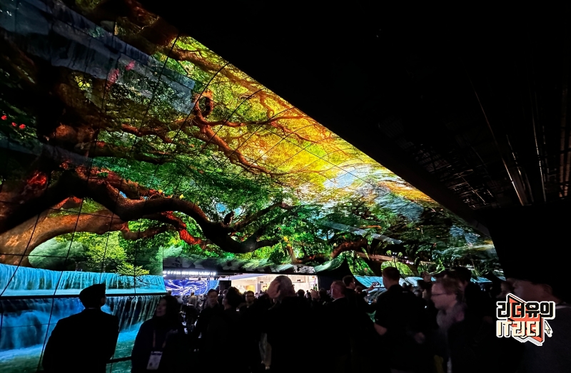LG전자는 들어서는 입구부터 압도적인 조형물로 눈길을 사로 잡았습니다. LG전자의 올레드 조형물은 LG전자 부스의 상징과도 같은 부분인데요. 올해는 260장의 올레드 플렉서블 사이니지를 이어 붙여 지구가 속해 있는 태양계, 별들의 궤적을 담은 밤하늘, 사하라 사막, 세렝게티 국립공워느 7개 폭포로 이루어진 딘얀디 폭포, 북극빙하, 거대 파도로 유명한 나자레 해변, 세계에서 가장 큰 레인트리, 동굴 안에서 기이한 빛의 예술을 보여주는 안텔로프 캐년까지 그 현장에 들어가 있는듯한 생생함을 보여줬습니다. 그 어떤 전시관도 보여주지 못한 압도적인 클래스의 조형물이었습니다.