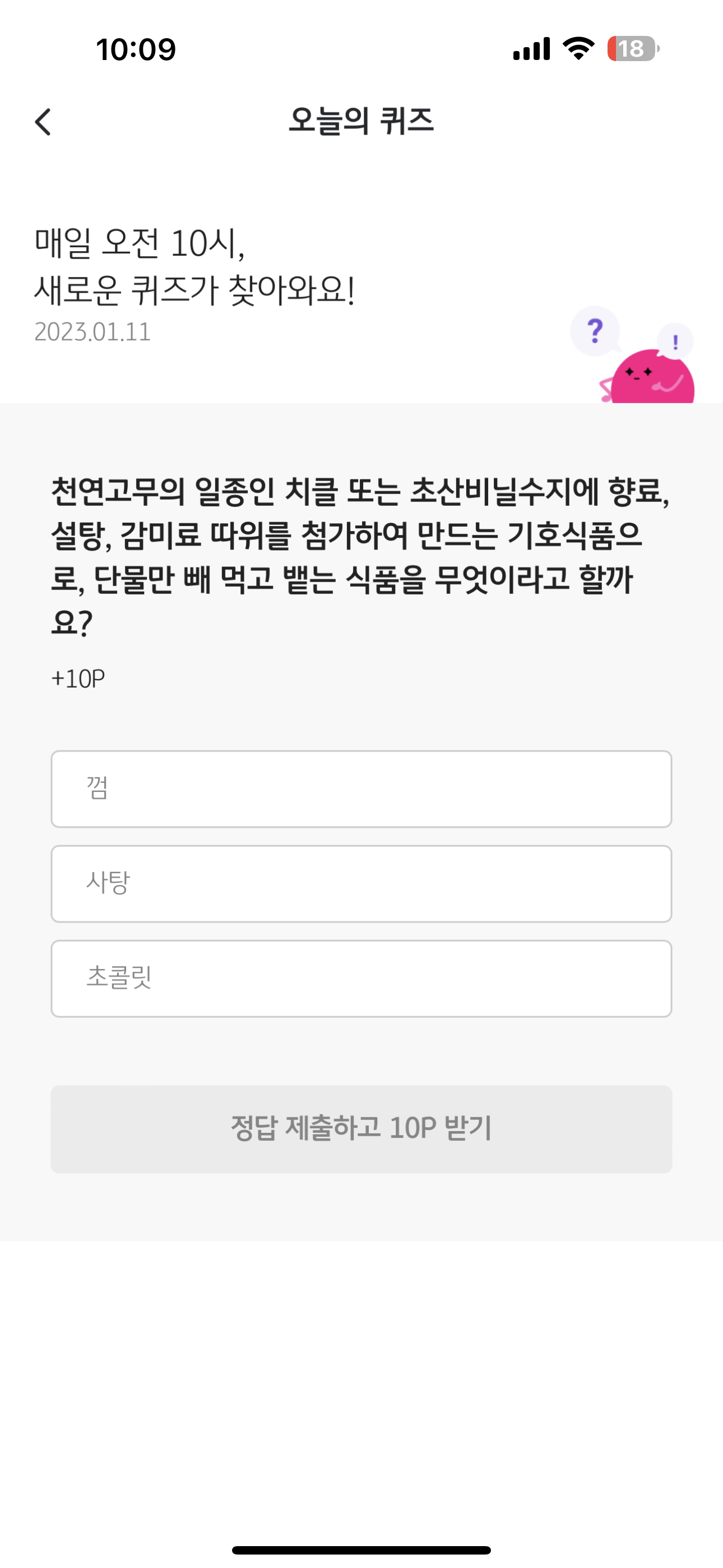 1월 11일 리브메이트 KB PAY 오늘의 퀴즈 정답은 껌 입니다