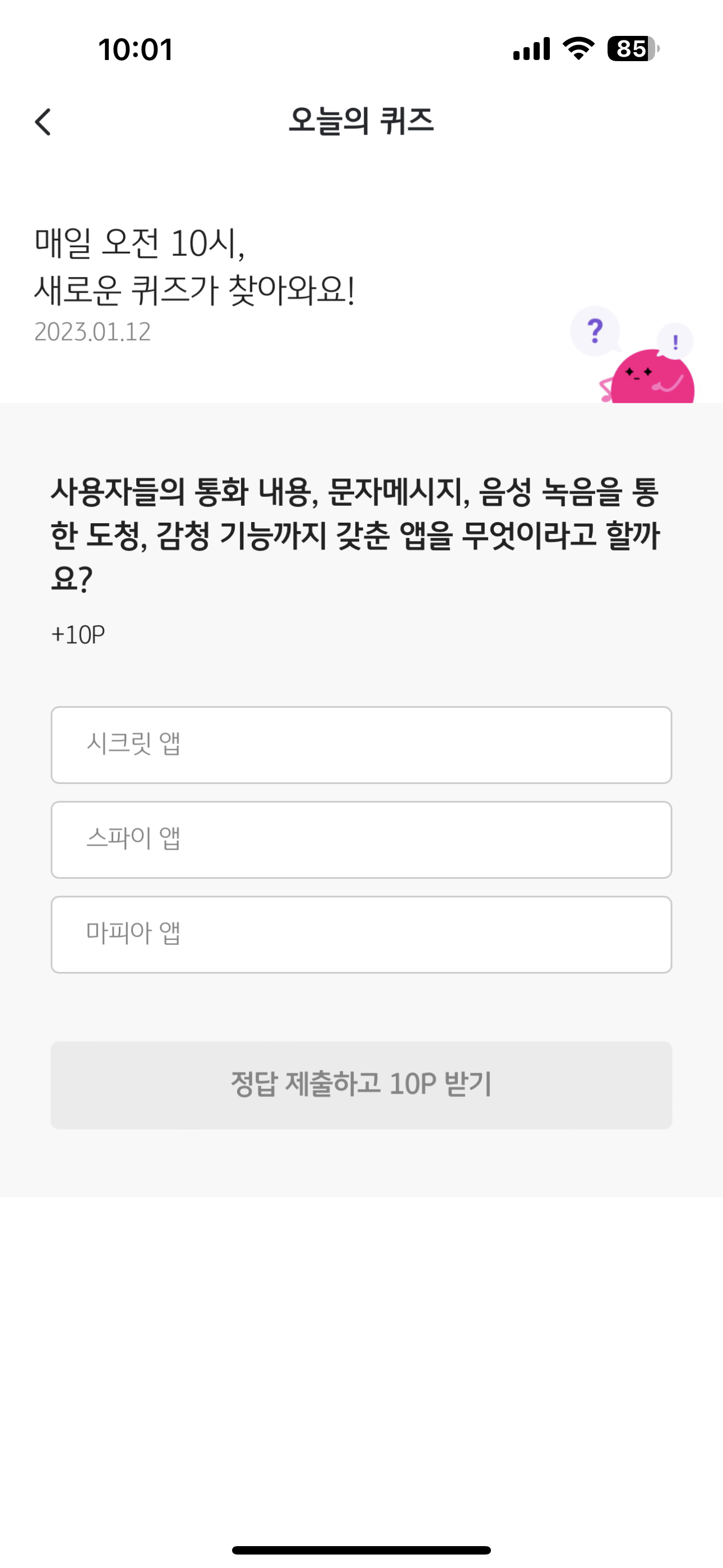 1월 12일 리브메이트 KB PAY 오늘의 퀴즈 정답은 스파이 앱 입니다