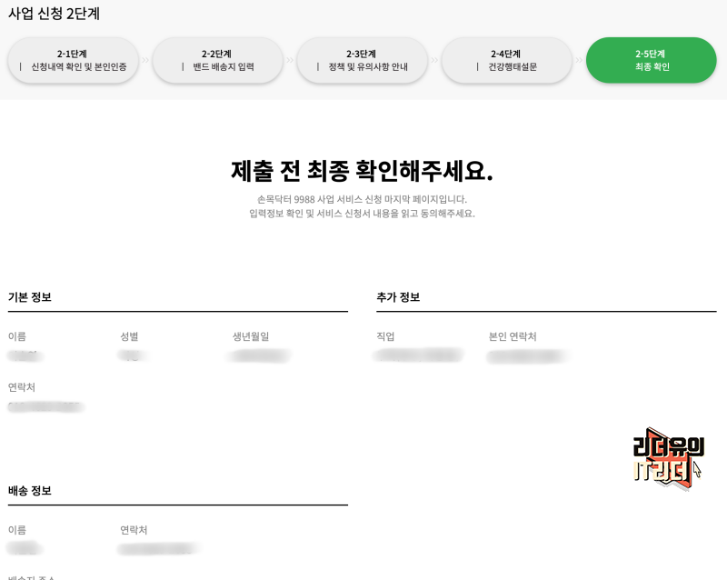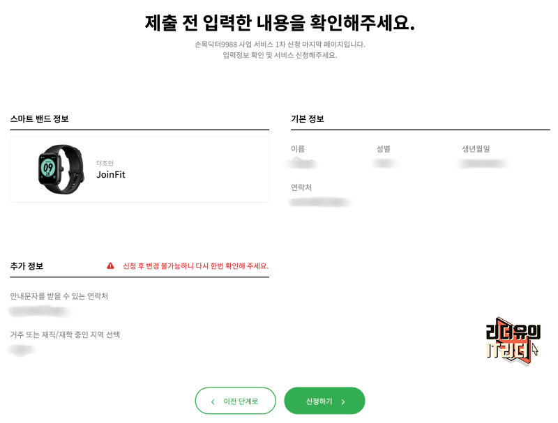 서울시 손목닥터9988 신청 제출 전 입력한 내용을 다시 한번 확인하고 신청하기에 들어갑니다. 지금까지는 스마트워치를 선택하는 과정이고 본격적인 신청은 지금부터 입니다.