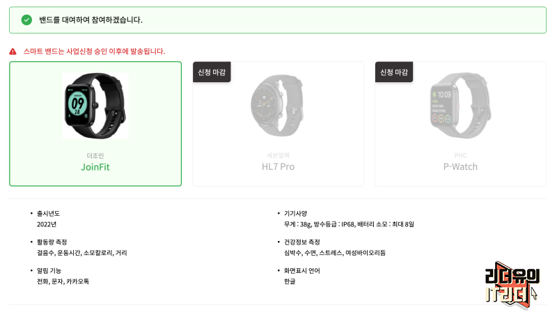 이제 신청 정보를 입력하는데요. 스마트워치(스마트밴드)는 대여 또는 본인이 사용하는 밴드를 이용할 수 있습니다. 스마트워치는 3종류가 있다고 하는데 이미 2개는 신청 마감되었다고 하네요. 선착순 신청이니 서둘러서 하면 좋을 것 같습니다. 그리고 계속해서 신청은 받으니 스마트워치가 채워지면 또 받는 것 같습니다.