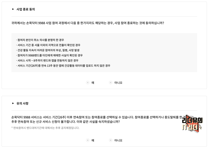 서울시 손목닥터9988 사업 참여 종료에 대한 내용을 확인합니다. 본인이 취소를 신청한 경우, 다른 지역으로 이사나 전출이 된 경우, 건강 활동 지속이 어려운 경우, 타인에게 매매한 사실이 확인된 경우, 앱을 연동하지 않은 경우, 연속 13주 동안 앱에 건강활동 데이터를 업로드 하지 않은 경우에는 자동으로 종료가 됩니다.