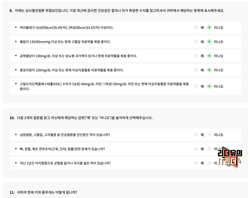 그리고 건강상태를 확인하는 설문을 받습니다. 자신의 건강 상태를 솔직하게 체크하면 됩니다.