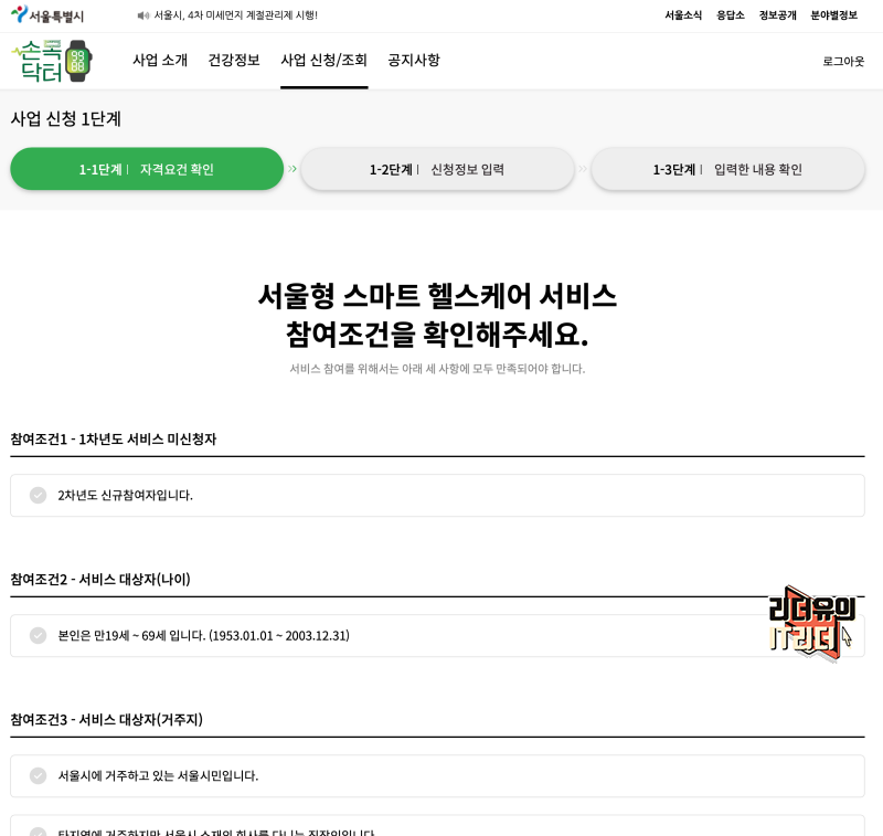 이제 서울시 손목닥터9988 대상자가 맞는지 참여 조건을 확인하는 과정을 거칩니다.