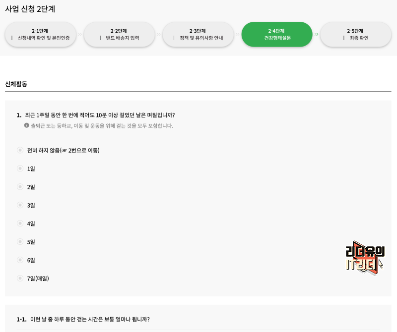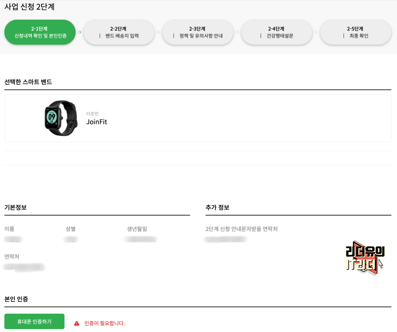 이제 신청 정보를 입력하는데요. 스마트워치(스마트밴드)는 대여 또는 본인이 사용하는 밴드를 이용할 수 있습니다. 스마트워치는 3종류가 있다고 하는데 이미 2개는 신청 마감되었다고 하네요. 선착순 신청이니 서둘러서 하면 좋을 것 같습니다. 그리고 계속해서 신청은 받으니 스마트워치가 채워지면 또 받는 것 같습니다.