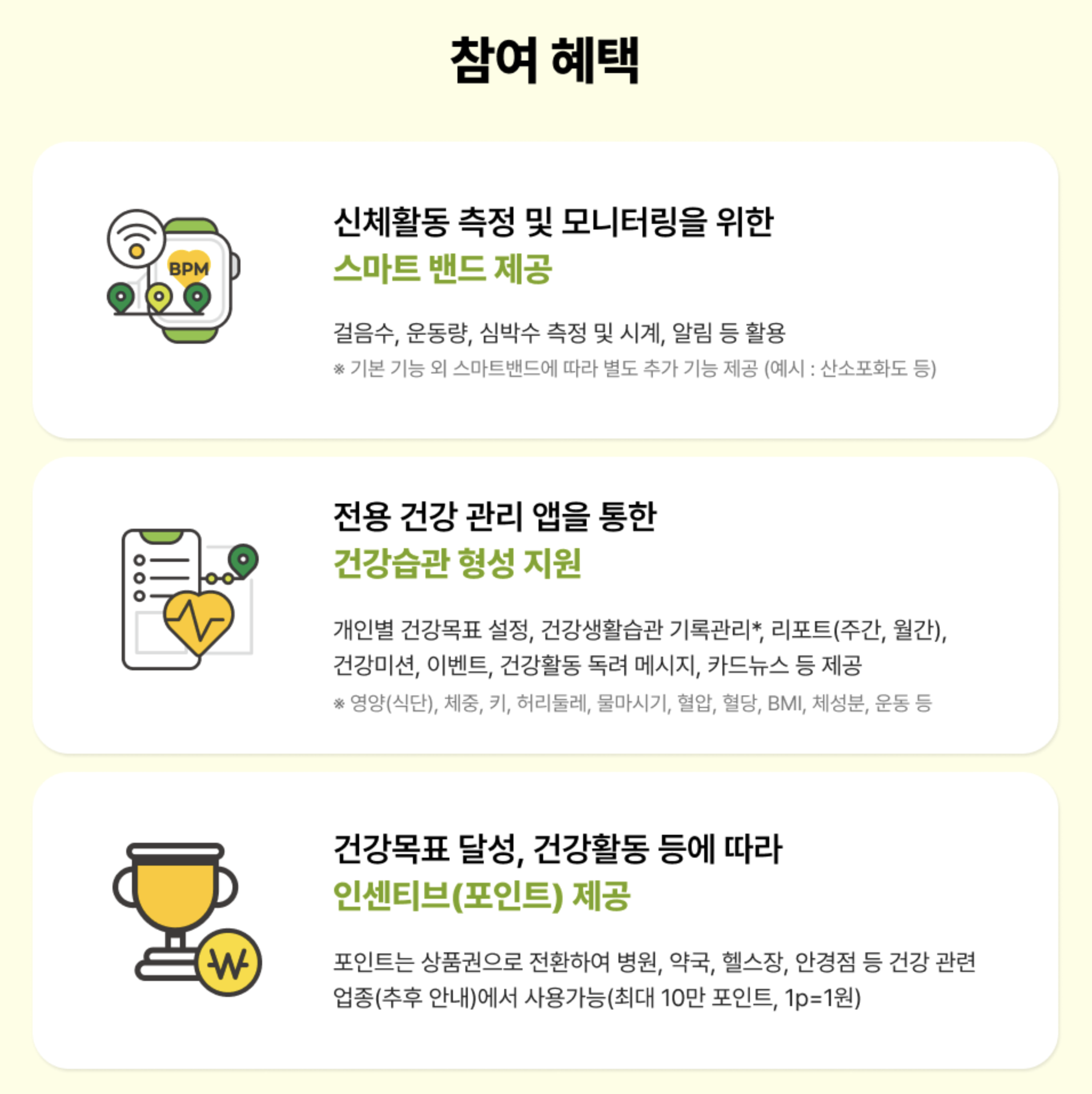 서울시 손목닥터9988 혜택은 스마트밴드(스마트워치)를 무료로 받을 수 있고 건강 관리 지원, 건강 목표 달성 시 인센티브(포인트)를 최대 10만 포인트 받을 수 있습니다. 상품권으로 전환해 병원, 약국, 헬스장, 안경점 등에서 사용이 가능하니 재테크로도 좋습니다.