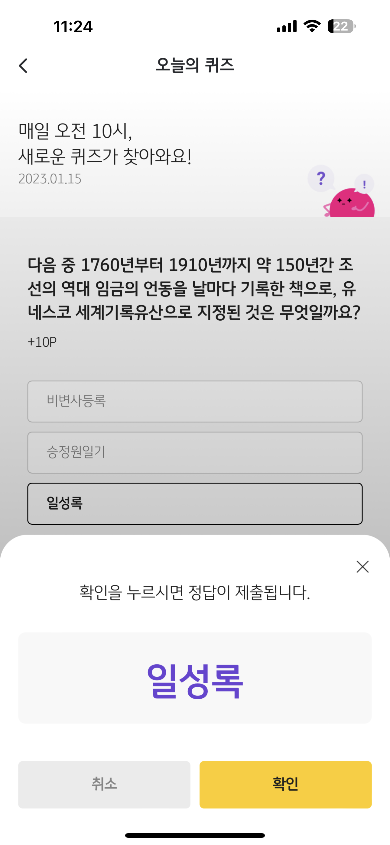 리브메이트 KB PAY 오늘의 퀴즈 1월 15일 정답 ( 다음 중 1760년부터 1910년까지 약 150년간 조선의 역대 임금의 언동을 날마다 기록한 책 )
