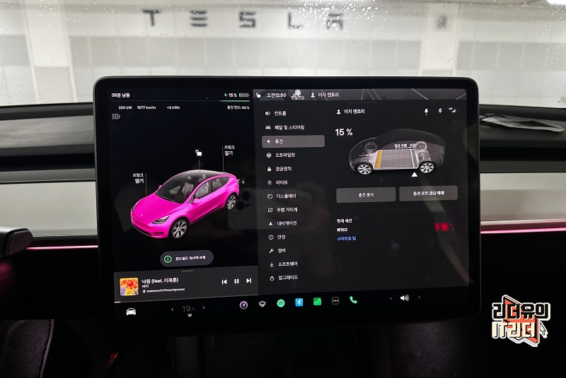 테슬라 모델Y 충전에 들어가니 바로 충전 관련 화면이 나오고 충전되는 것을 볼 수 있습니다. 15% 정도 남았을때 충전을 했는데요.