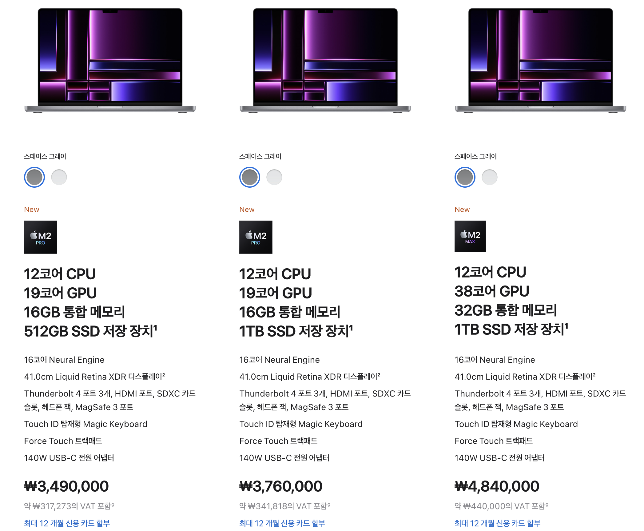 M2 Pro (M2 프로), M2 Max(M2 맥스) 맥북프로 16 가격도 마찬가지로 M2 Pro 모델 2가지로 구성되어 있습니다. 가장 기본이 되는 모델은 3,490,000원이고 저장공간을 1TB로 늘린 모델은 3,760,000원 입니다. 아무래도 맥북프로 16은 영상 작업을 많이 하니 1TB 이상은 가주는게 좋습니다