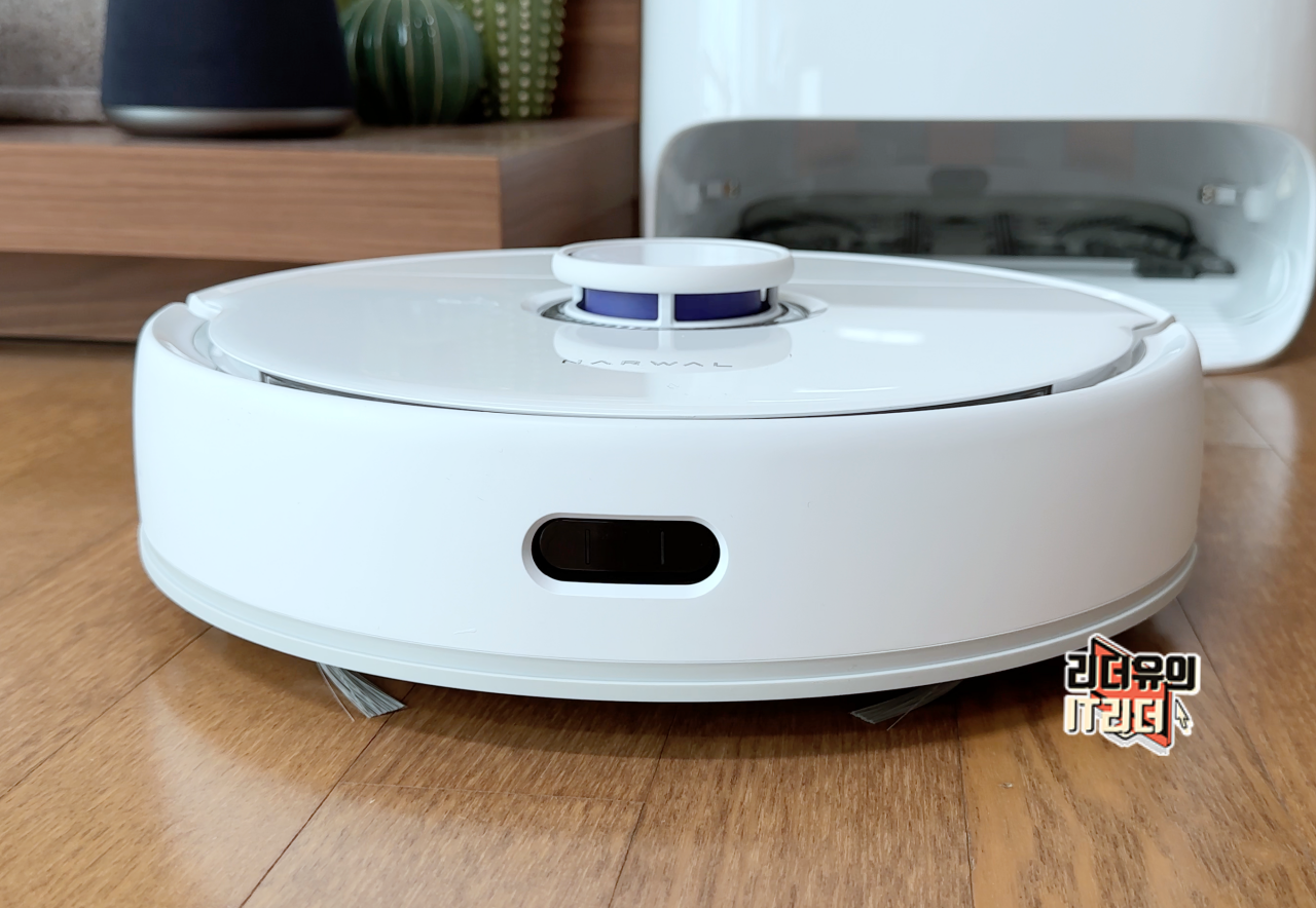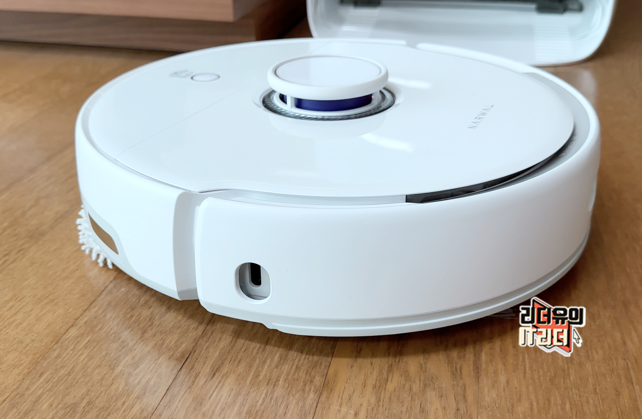 사이드는 아무래도 충격을 고려해 매트한 화이트로 디자인 되어 있고 충격 범퍼와 PSD 벽 감지센서, 자외선 센서를 통해 사물을 정교하게 감지하고 움직일 수 있게 되어 있습니다. 청소를 해보시면 정말 빈틈 없이 청소를 한다는 것을 알 수 있습니다.