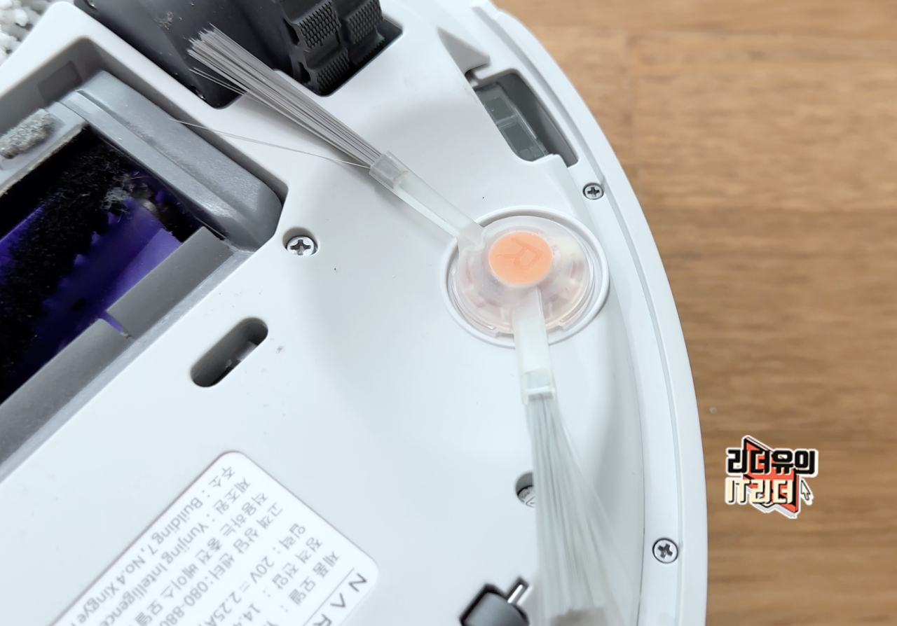 전면 부분에는 양옆에 V형 사이드 브러시가 있습니다. 사이드의 먼지를 쓸어 담는 기능을 하는데요. 좌우 색상으로 표시되어 있어 장착을 쉽게 할 수 있습니다.