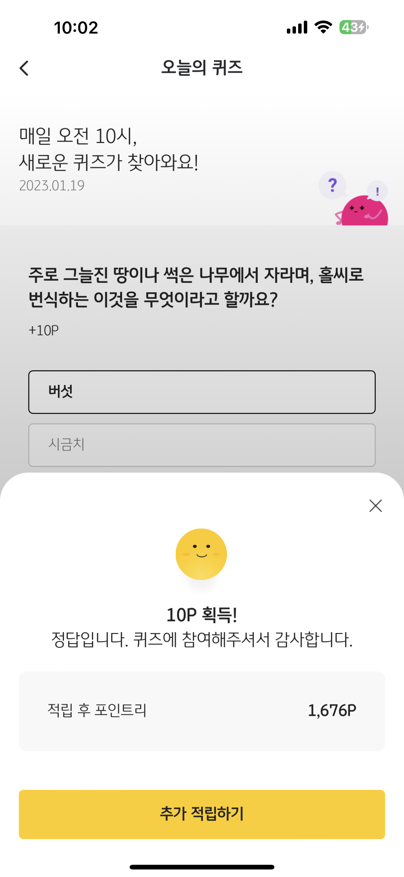 리브메이트 KB PAY 오늘의 퀴즈 1월 19일 정답은 버섯입니다