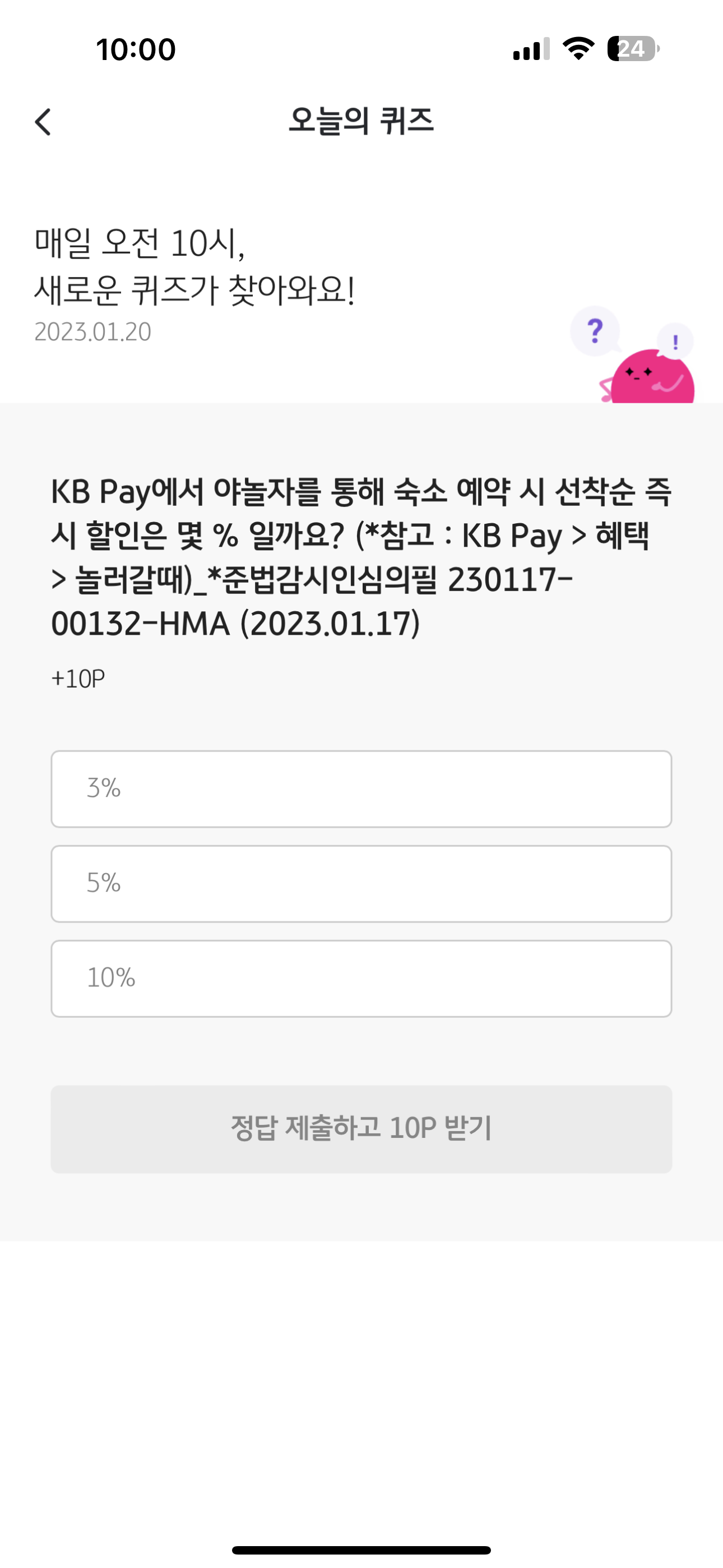 KB Pay에서 야놀자를 통해 숙소 예약 시 선착순 즉시 할인은 몇 % 일까요? (*참고 : KB Pay > 혜택 > 놀러갈때)_*준법감시인심의필 230117-00132-HMA (2023.01.17) 보기는 1. 3% 2. 5% 3. 10% 입니다.