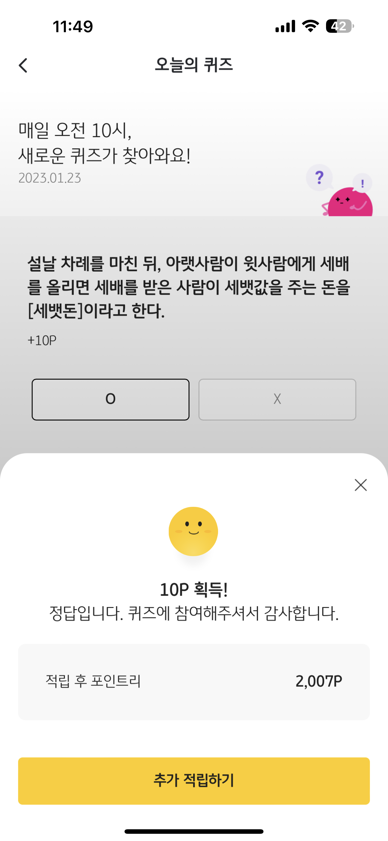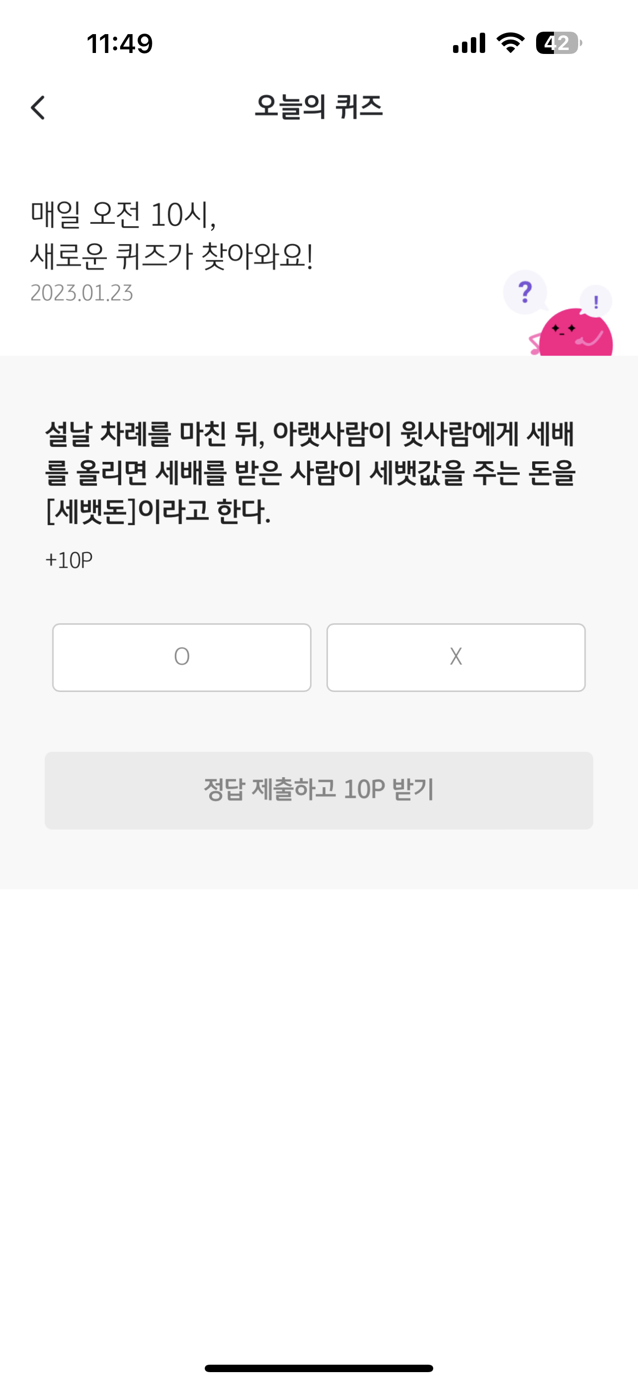 설날 차례를 마친 뒤, 아랫사람이 윗사람에게 세배를 올리면 세배를 받은 사람이 세뱃값을 주는 돈을 [세뱃돈]이라고 한다. O,X 퀴즈로 나왔는데요. 당연히 세뱃돈이라 생각하지만 혹시나 함정이 있지 않을까 생각이 드시죠? 세배는 어른이 무사히 겨울을 넘기고 새해를 맞은 것을 기념해 무안드리는 것에서 비롯됐는데 이때 인사를 찾아온 이들에게 차례음식 등을 건네며 덕담을 주고받은 것이 현재 세뱃돈의 기원이라고 전해지고 있습니다.