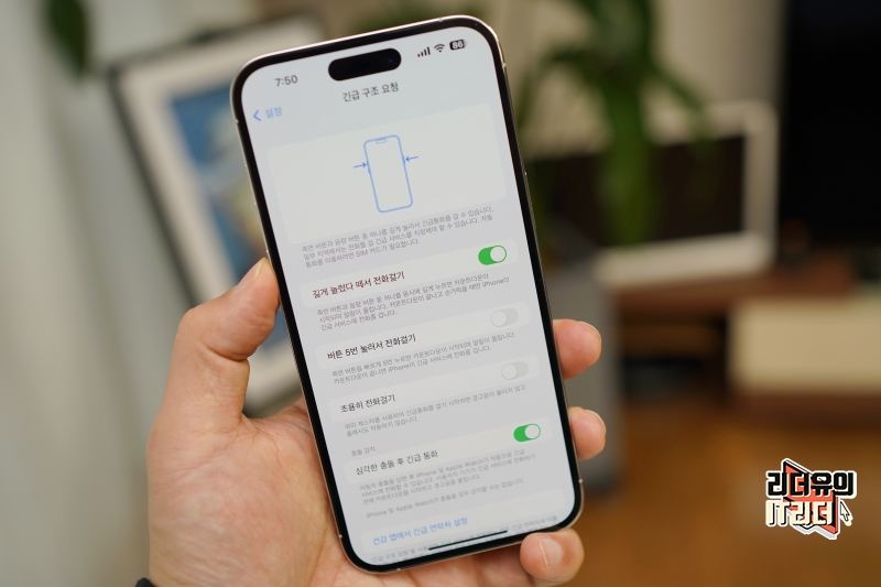 • 측면 버튼과 위아래 음량 버튼 중 하나를 함께 눌러야만 긴급 구조 요청이 작동되도록 하여 실수로 긴급통화가 걸리는 것을 방지함