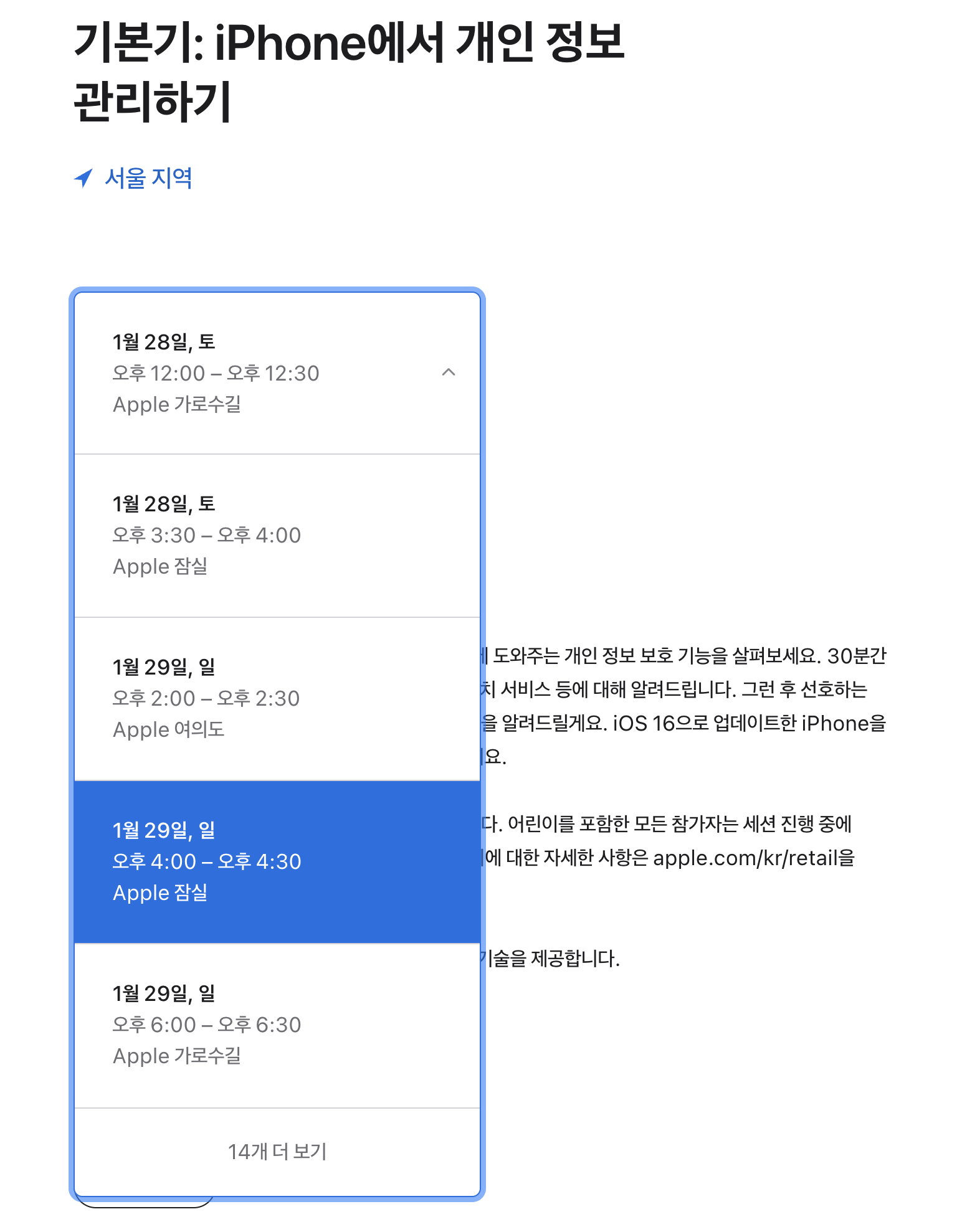 이번 아이폰에서 개인 정보 관리하기 세션은 30분 동안 진행되는데요 전 세계 모든 애플스토에서 제공되고 새롭게 제공되는 그룹 예약을 통해 단체별로 세션 일정을 신청할 수도 있습니다.