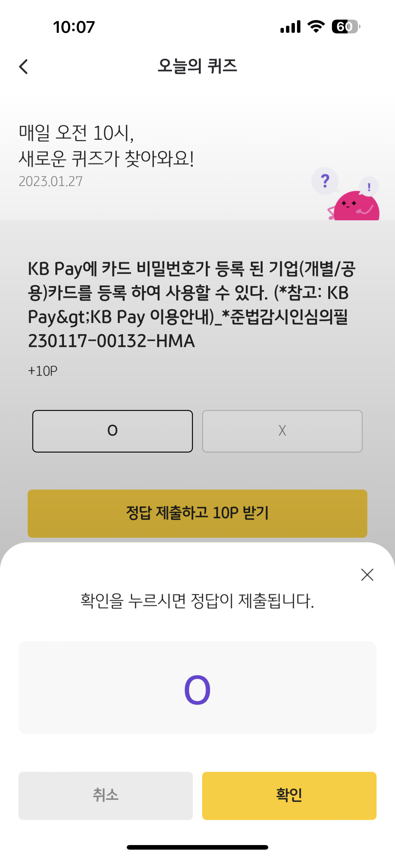리브메이트 KB PAY 오늘의 퀴즈 1월 27일 정답은 O 입니다