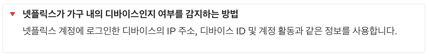 넷플릭스 계정 공유를 감지하는 방법은 넷플릭스 게정에 로그인한 디바이스 IP주소, 디바이스 ID 및 계정 활동과 같은 정보를 사용해 판단한다고 합니다. 아무래도 주 사용 IP를 파악해 계정을 관리한다는 것인데요.