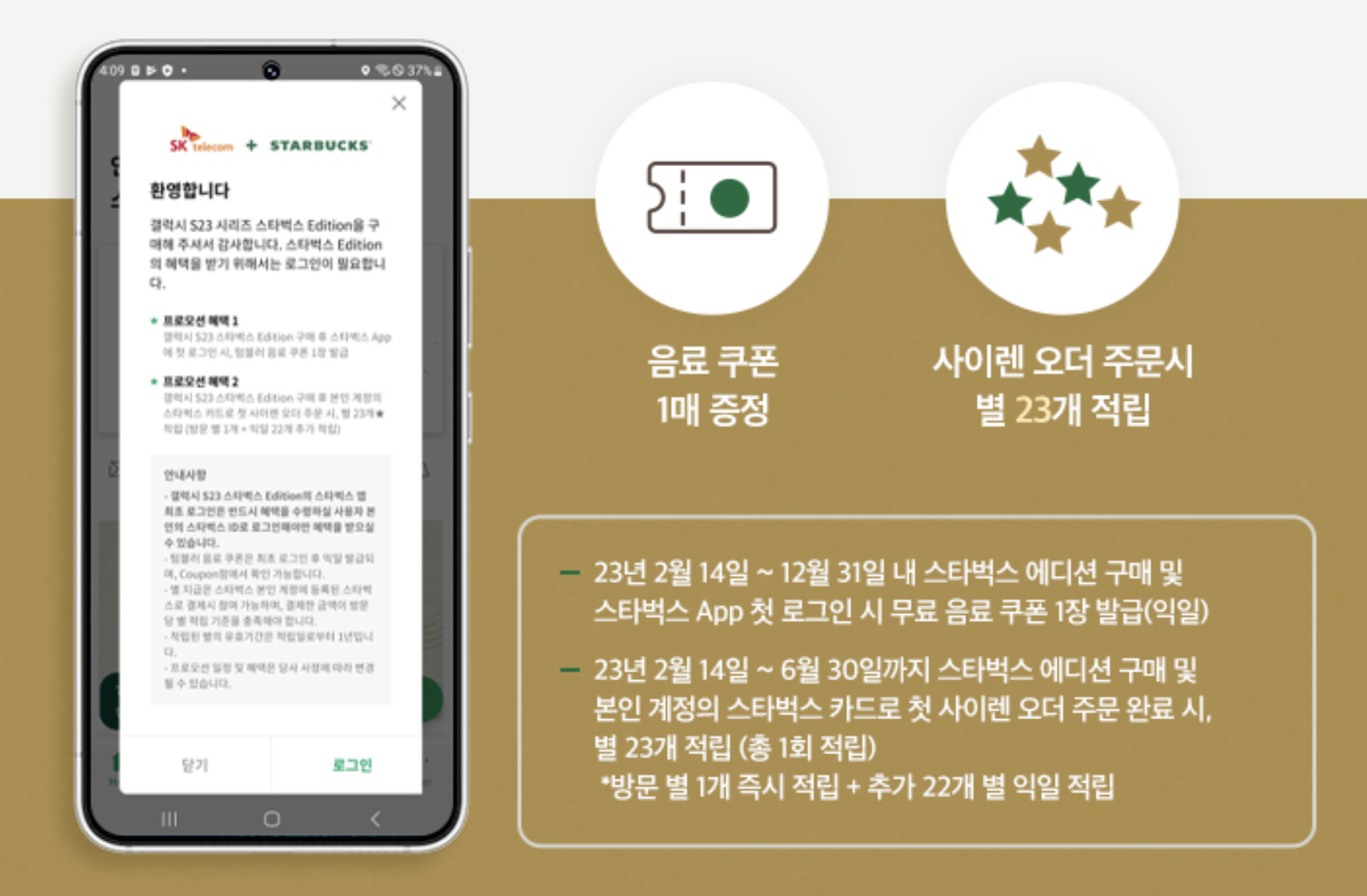 갤럭시S23 울트라 스타벅스 에디션을 구입하면 음료 쿠폰 1매와 사이렌 오더 주문시 별 23개 적립을 받을 수 있습니다. 보통 텀블러 사도 음료 쿠폰 1매는 주는데요. 조금 약한 것 같다는 생각이 드네요