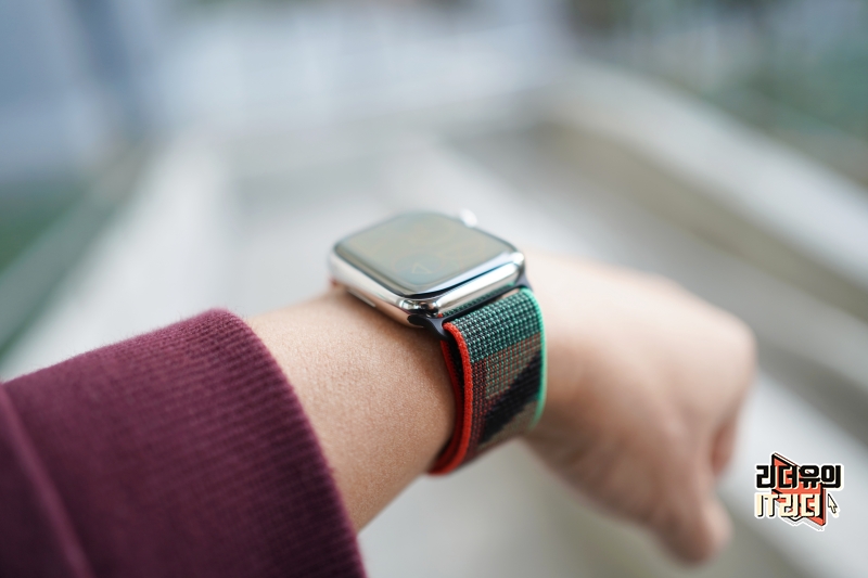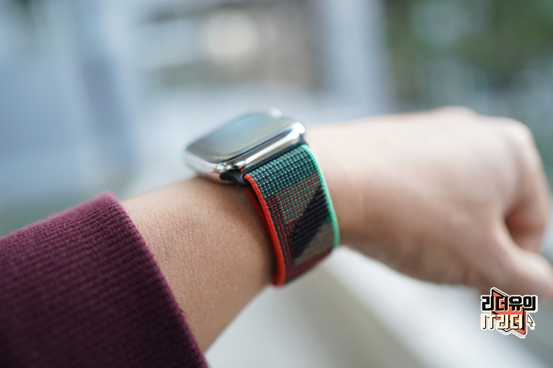 애플워치8 스테인리스 스틸 실버 블랙 유니티 스포츠 루프 착용 모습
