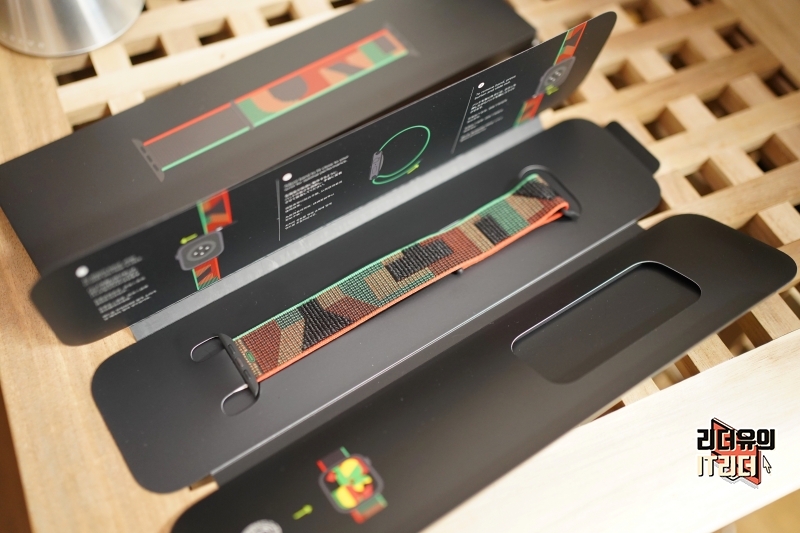 애플워치 블랙 유니티 스포츠 루프 밴드(스트랩)가 들어 있는 모습입니다. 안쪽에는 어떻게 장착하는지? 어떻게 길이 조정을 하는지? 새로운 애플워치 유니티 워치페이스를 바로 적용할 수 있는 코드가 있습니다.
