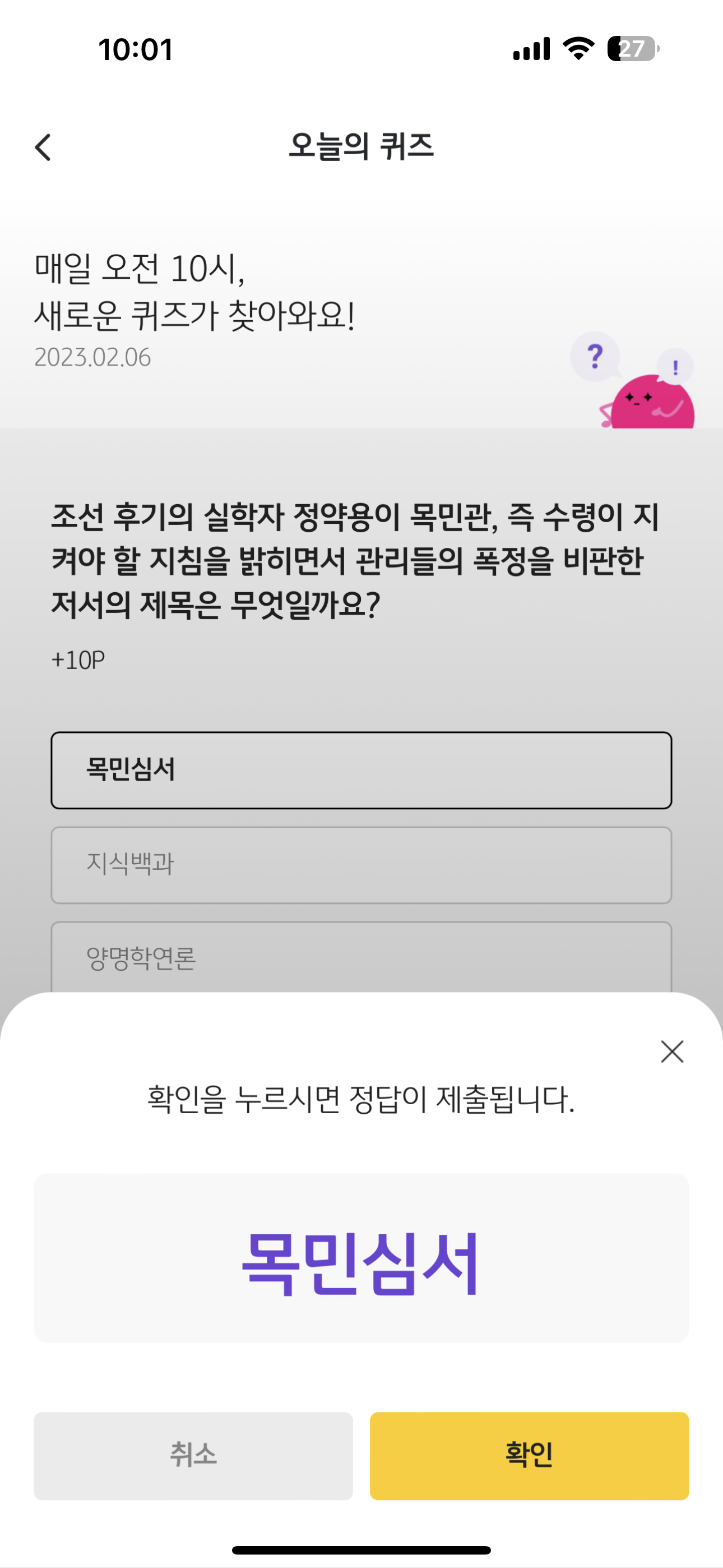 리브메이트 KB PAY 오늘의 퀴즈 2월 6일 정답 ( 조선 후기의 실학자 정약용이 목민관, 즉 수령이 지켜야 할 지침을 밝히면서 관리 )