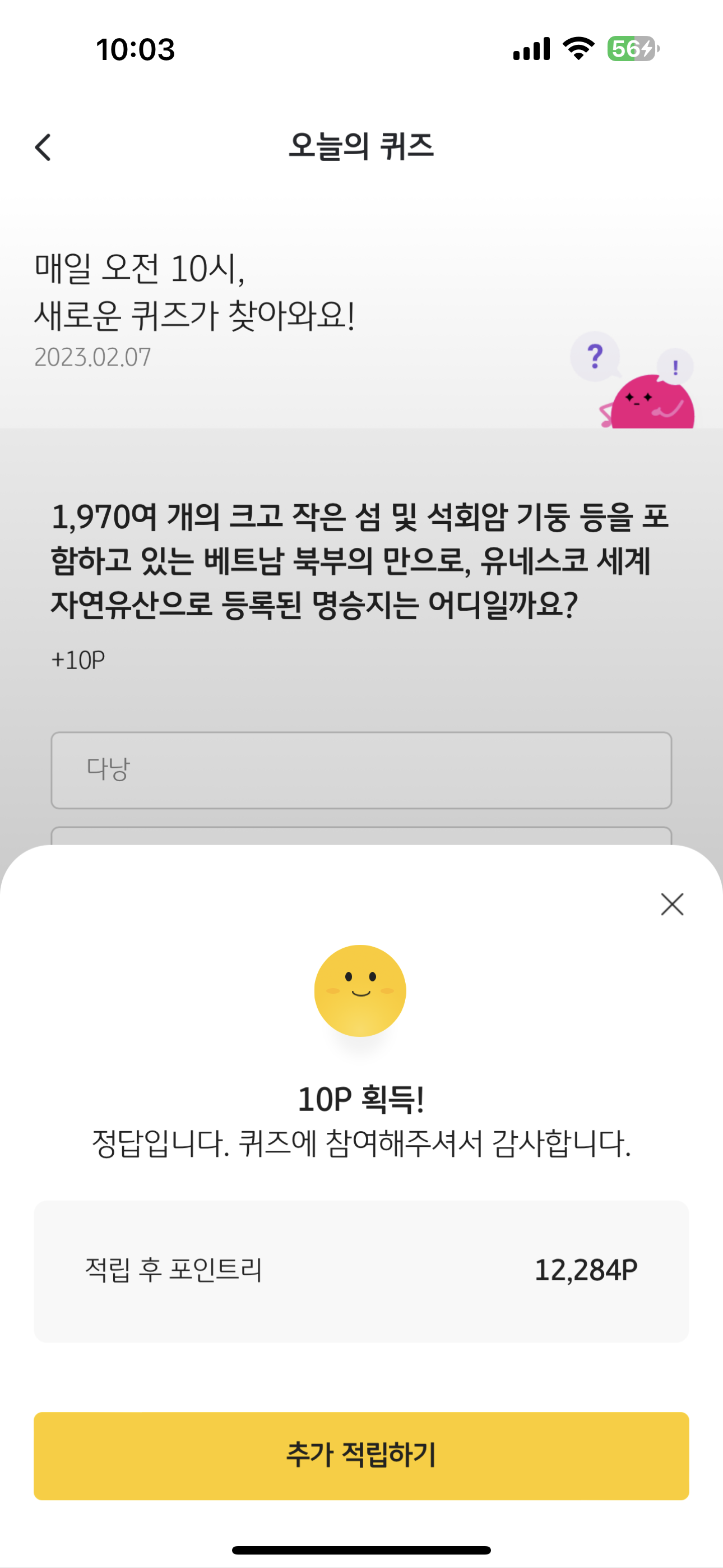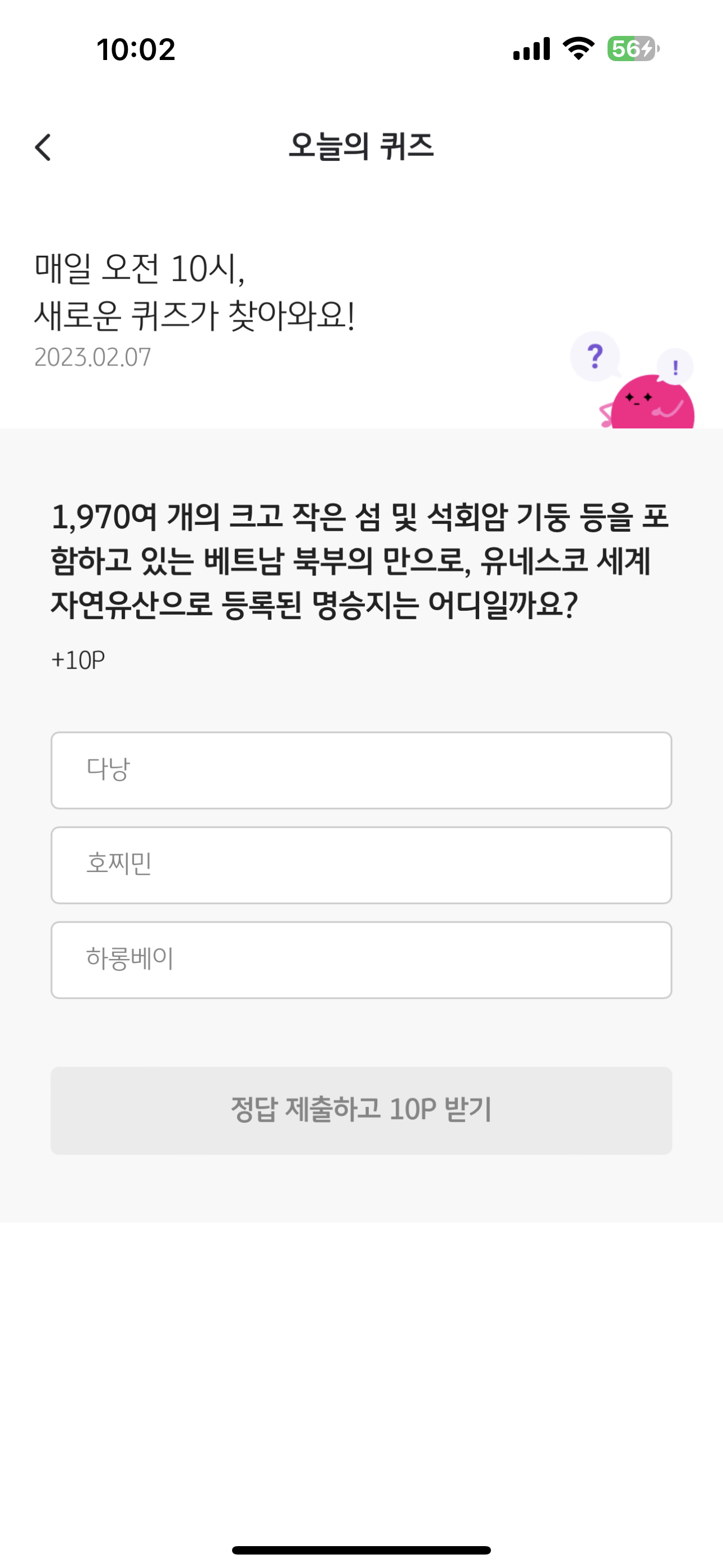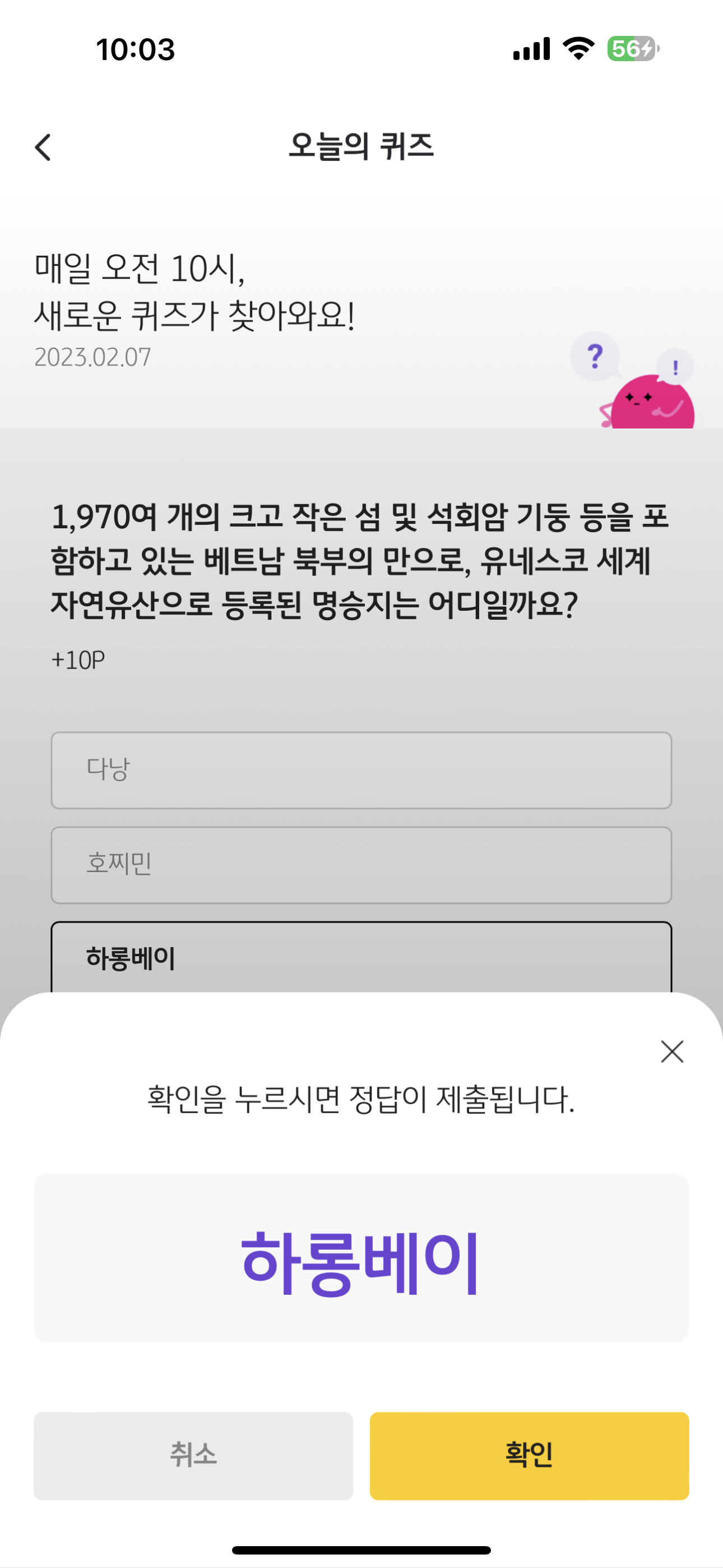 리브메이트 KB PAY 오늘의 퀴즈 2월 7일 정답은 하롱베이 입니다