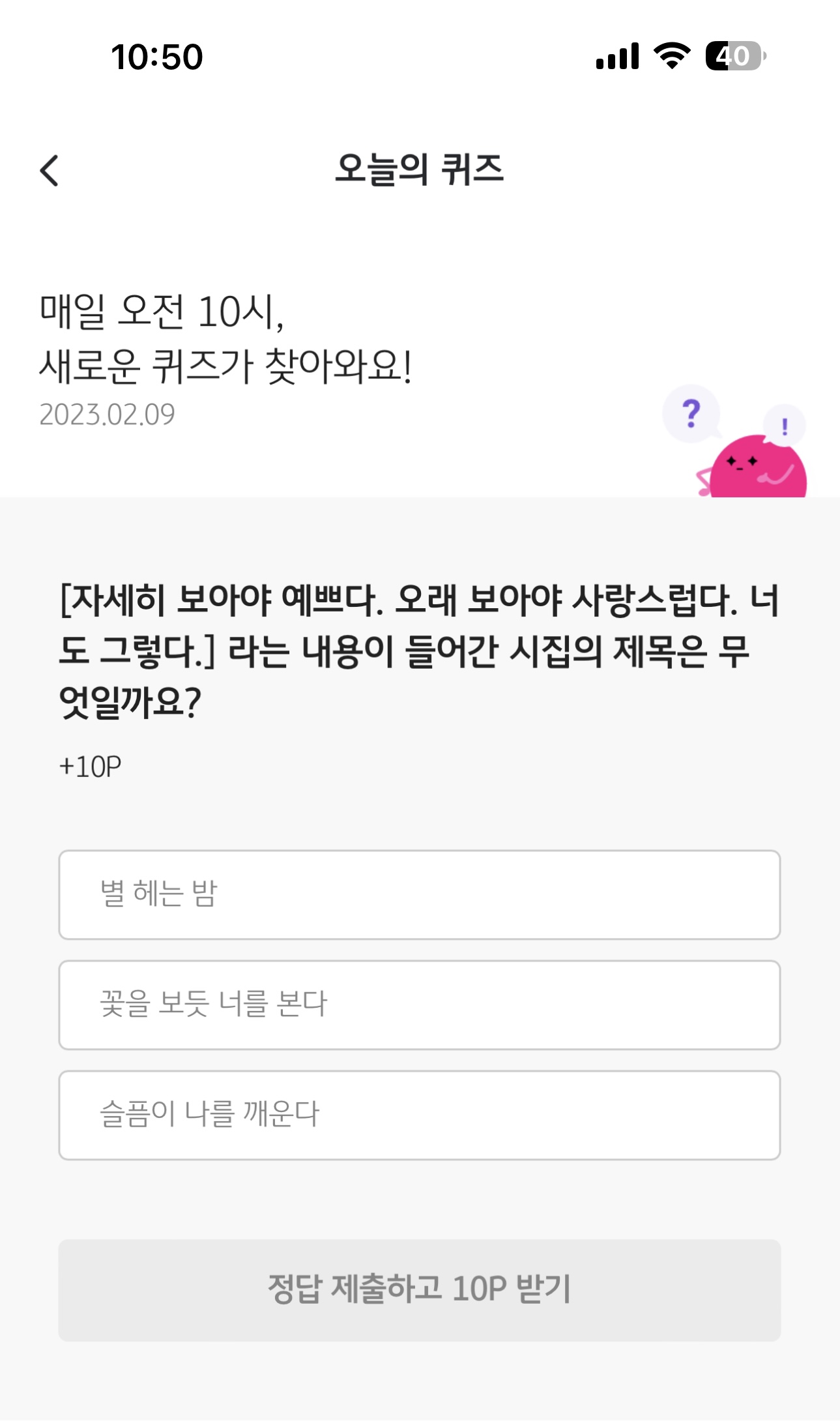 [자세히 보아야 예쁘다. 오래 보아야 사랑스럽다. 너도 그렇다.]라는 내용이 들어간 시집의 제목은 무엇일까요? 보기는 1. 별 헤는 밤 2. 꽃을 보듯 너를 본다 3. 슬픔이 나를 깨운다 입니다. 시 글귀를 보면 어느 정도 정답을 유추해 볼 수 있죠.