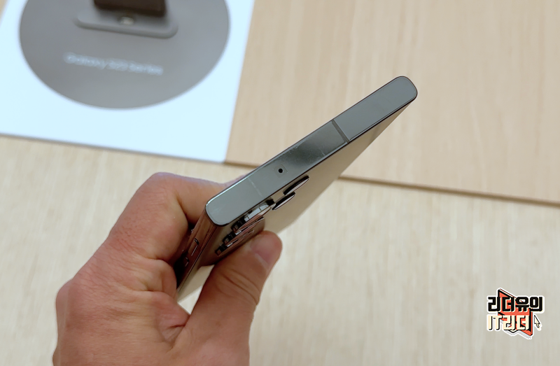 갤럭시S23 울트라 그린 윗면 모습입니다. 플랫한 디자인으로 깔끔한 디자인을 볼 수 있습니다. 그리고 유광의 메탈 프레임으로 되어 있어 후면은 무광, 사이드는 유광으로 조화로운 디자인을 볼 수 있습니다.