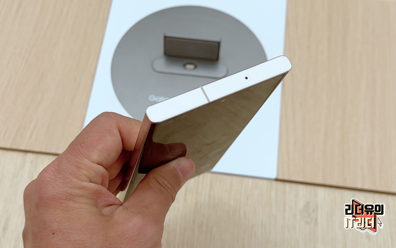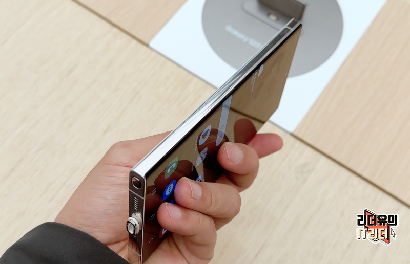 갤럭시S23 울트라 크림 윗면 모습입니다. 윗면은 플랫한 디자인으로 엣지가 들어간 스마트폰을 중화시켜 주는 디자인입니다.