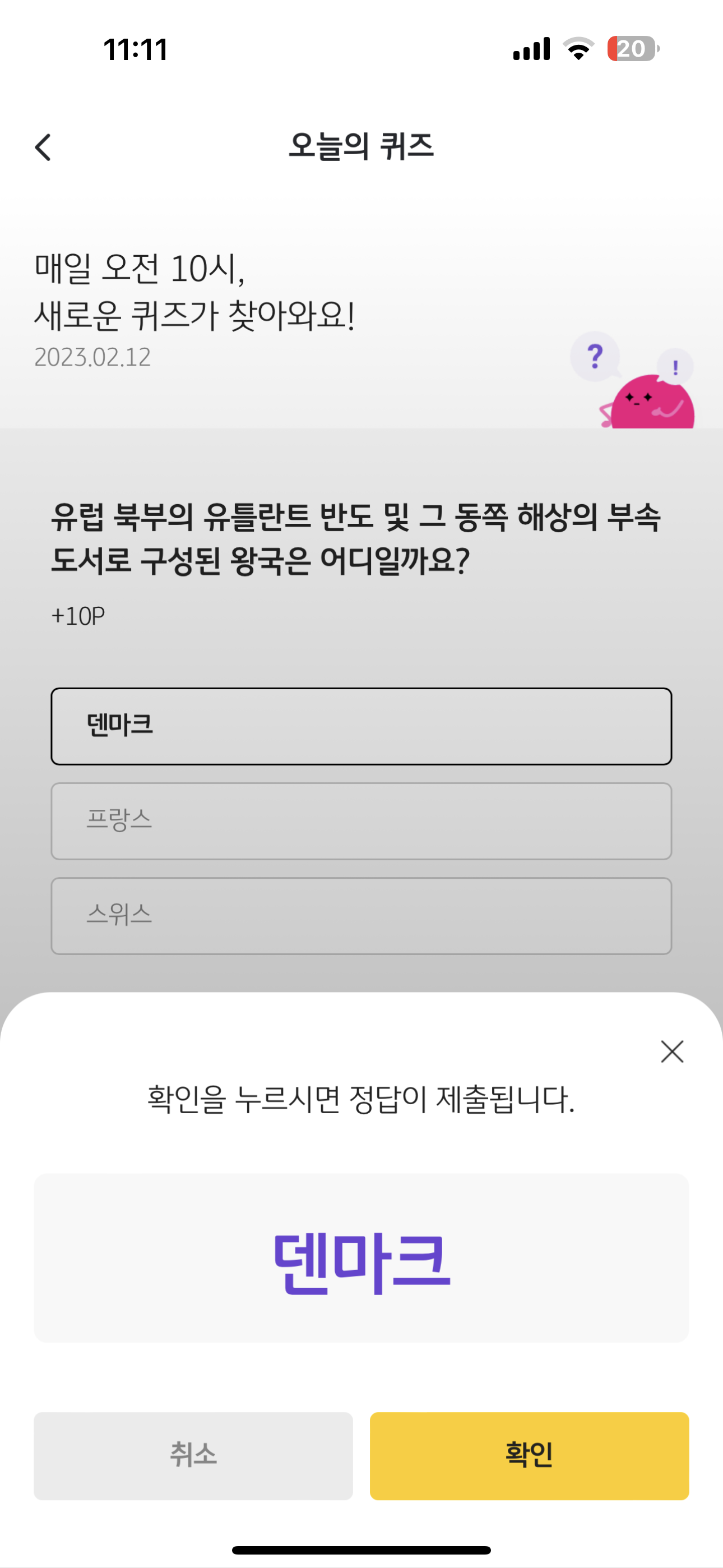 리브메이트 KB PAY 오늘의 퀴즈 2월 12일 정답은 덴마크 입니다