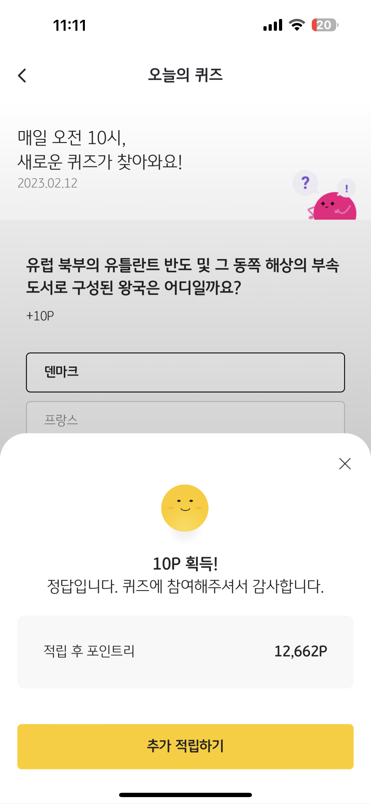 리브메이트 KB PAY 오늘의 퀴즈 2월 12일 정답은 덴마크 입니다