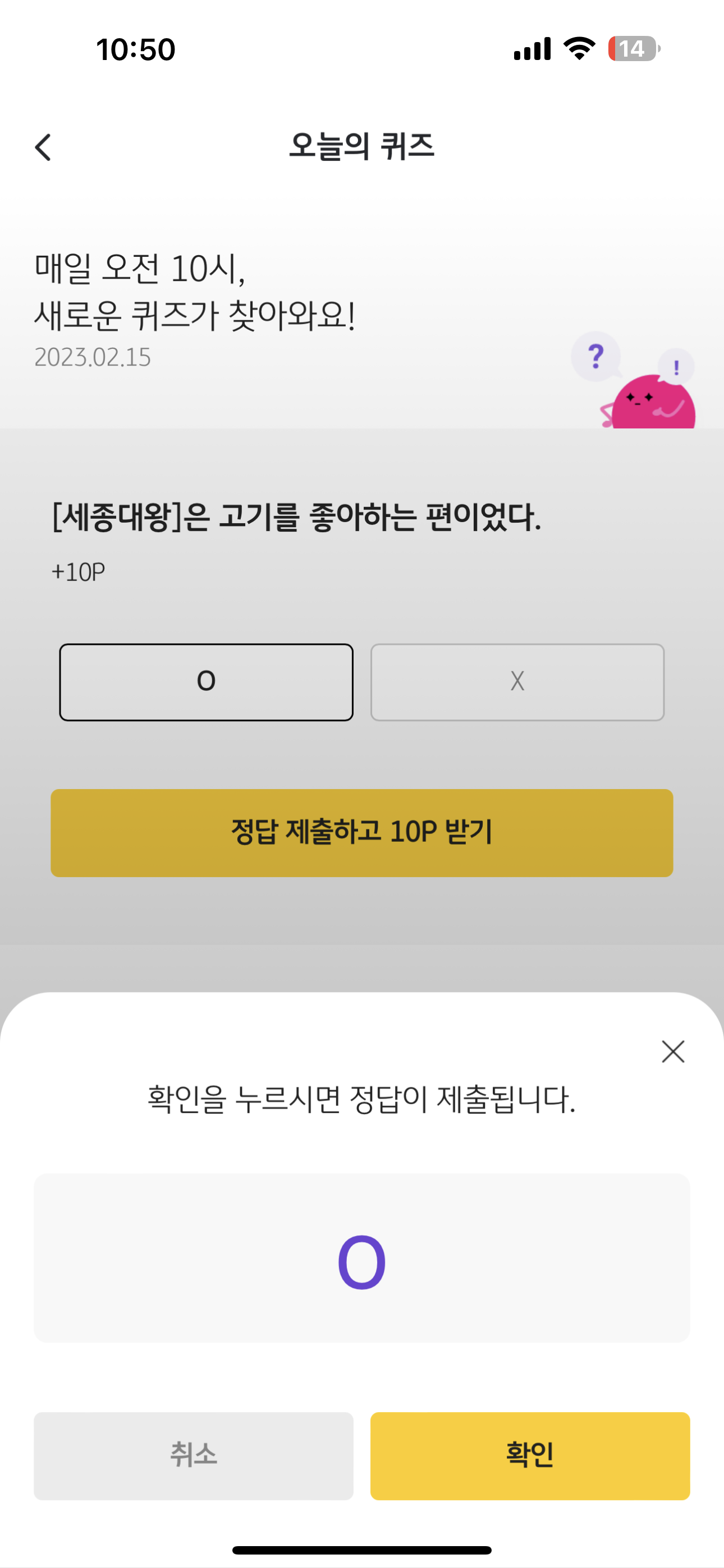 리브메이트 KB PAY 오늘의 퀴즈 2월 15일 정답 ( 세종대왕은 고기를 좋아하는 편이었다. )