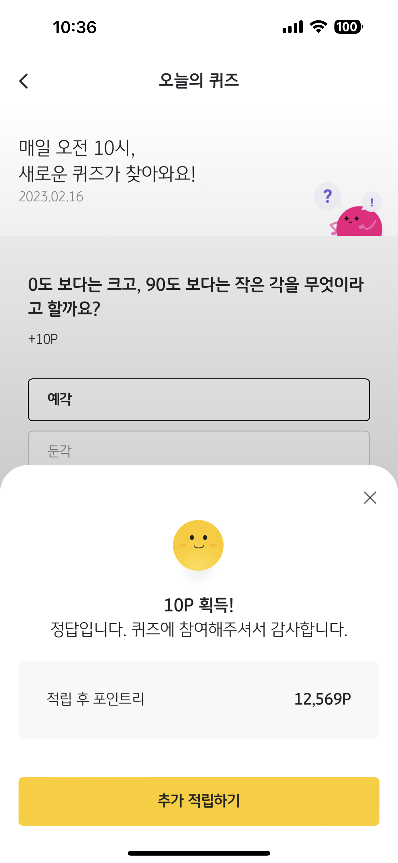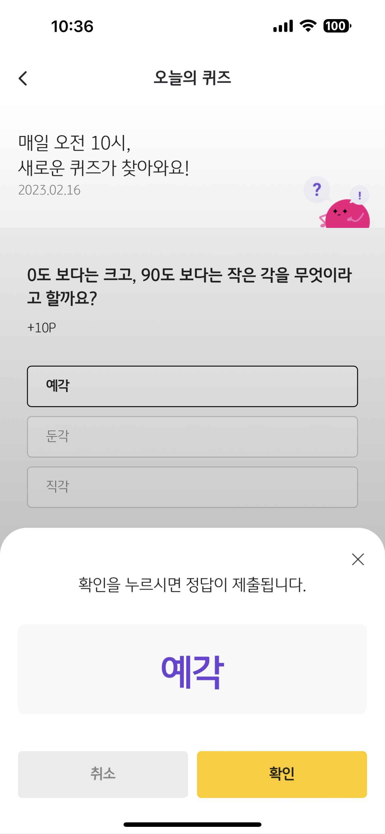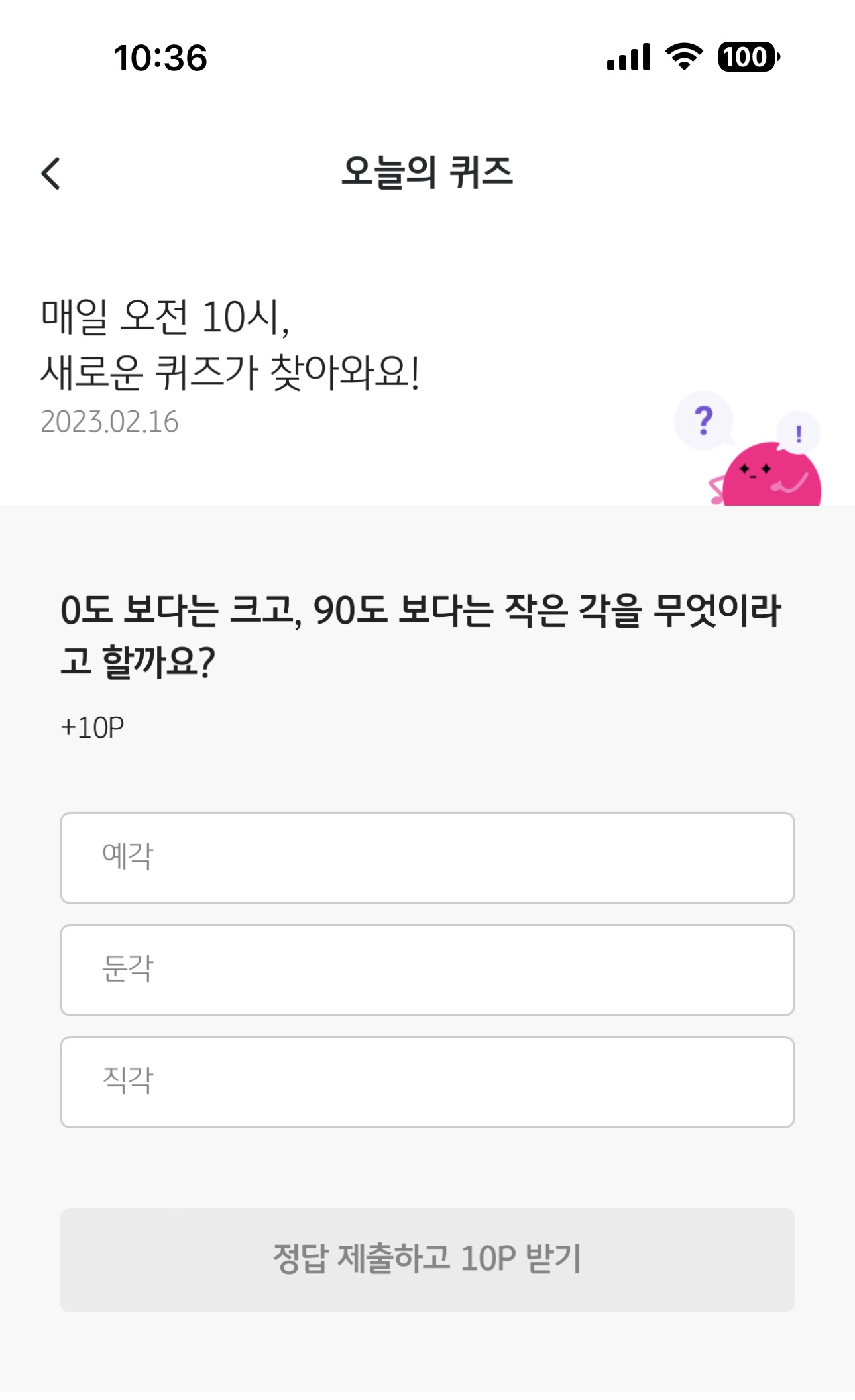 리브메이트 KB PAY 오늘의 퀴즈 2월 16일 정답은 예각 입니다