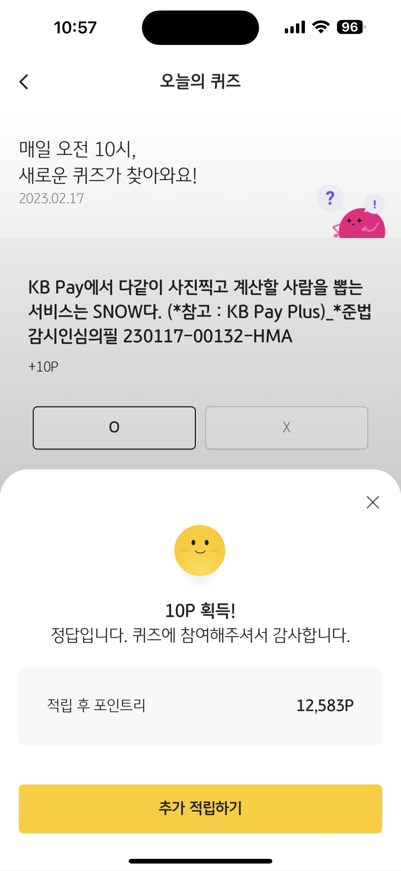 KB Pay에서 다같이 사진찍고 계산할 사람을 뽑는 서비스는 SNOW다. (*참고 : KB Pay Plus)_*준법감시인심의필 230117-00132-HMA O,X 퀴즈인데요. 오늘의 정답은