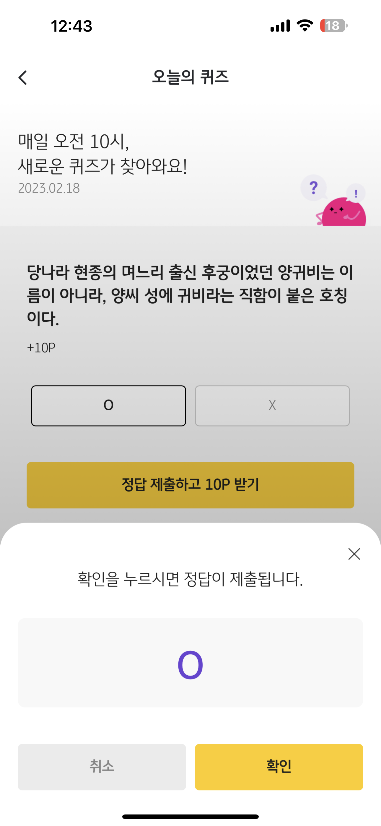 리브메이트 KB PAY 오늘의 퀴즈 2월 18일 정답은 O 입니다
