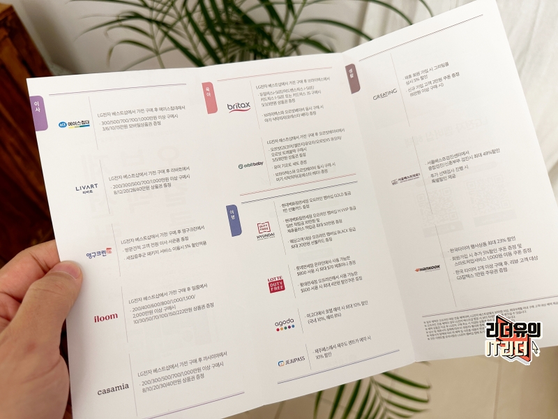 그리고 육아는 브라이텍스, 오르빗베이비, 다이치 브랜드와 제휴를 맺었고 여행은 아고다, 롯데면세점, 현대백화점 면세점, 제주 패스와 제휴를 맺고 있습니다. 그리고 생활 카테고리는 그리팅, 생어거스틴, 한국타이어, 서울베스트 검진센터와 제휴를 맺고 있습니다. 실질적으로 많이 이용하는 브랜드와 제휴를 통해 파격적인 할인 혜택을 제공하니 LG 베스트샵 가전 구입시 잘 활용하면 좋습니다.