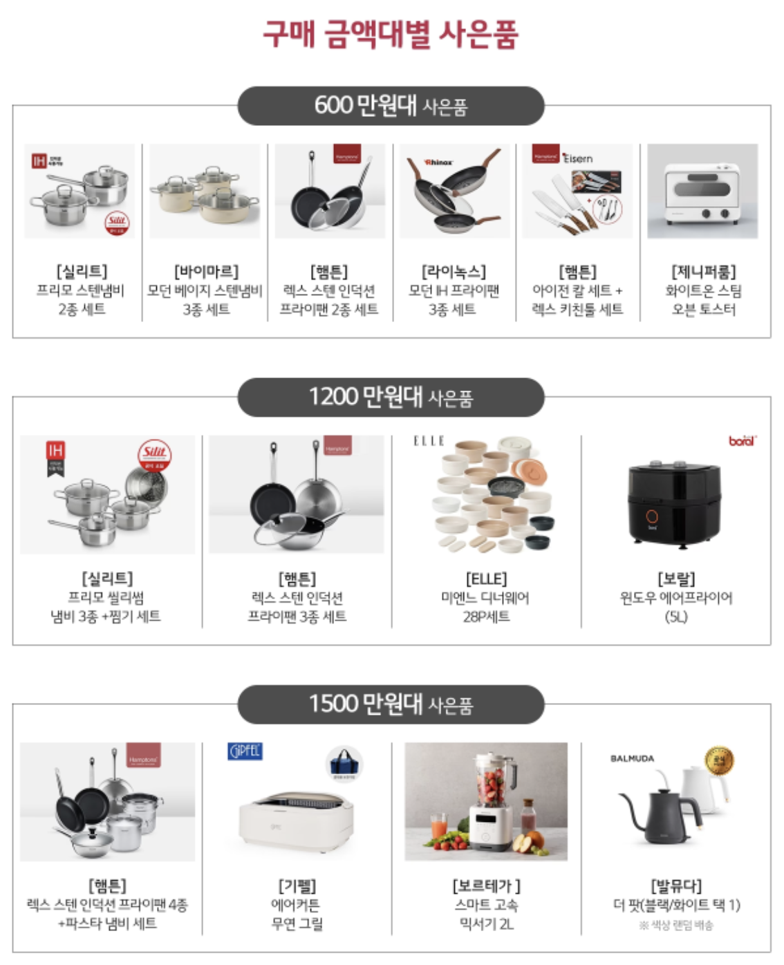 그리고 구매 금액대별 사은품 및 포인트도 있습니다. 사은품은 구매 금액대별 다양하게 준비되어 있는데, 주방 조리 기구들로 구성하여 실제로 유용하게 사용 가능합니다. 포인트 또한 300/600/1,200/1,500만 원 대별로 각 5/20/40/50만 포인트가 지급됩니다. 포인트는 나중에 LG 베스트샵을 다시 방문하게 된다면 쓸 수 있겠죠. 혼수 가전, 이사 가전은 아무래도 다품목 선택을 하니 여러모로 LG 베스트샵 혜택이 좋을 수 있습니다. 더불어 포인트와 풍성한 사은품까지 받아간다면 1석 2조 아닐까요?